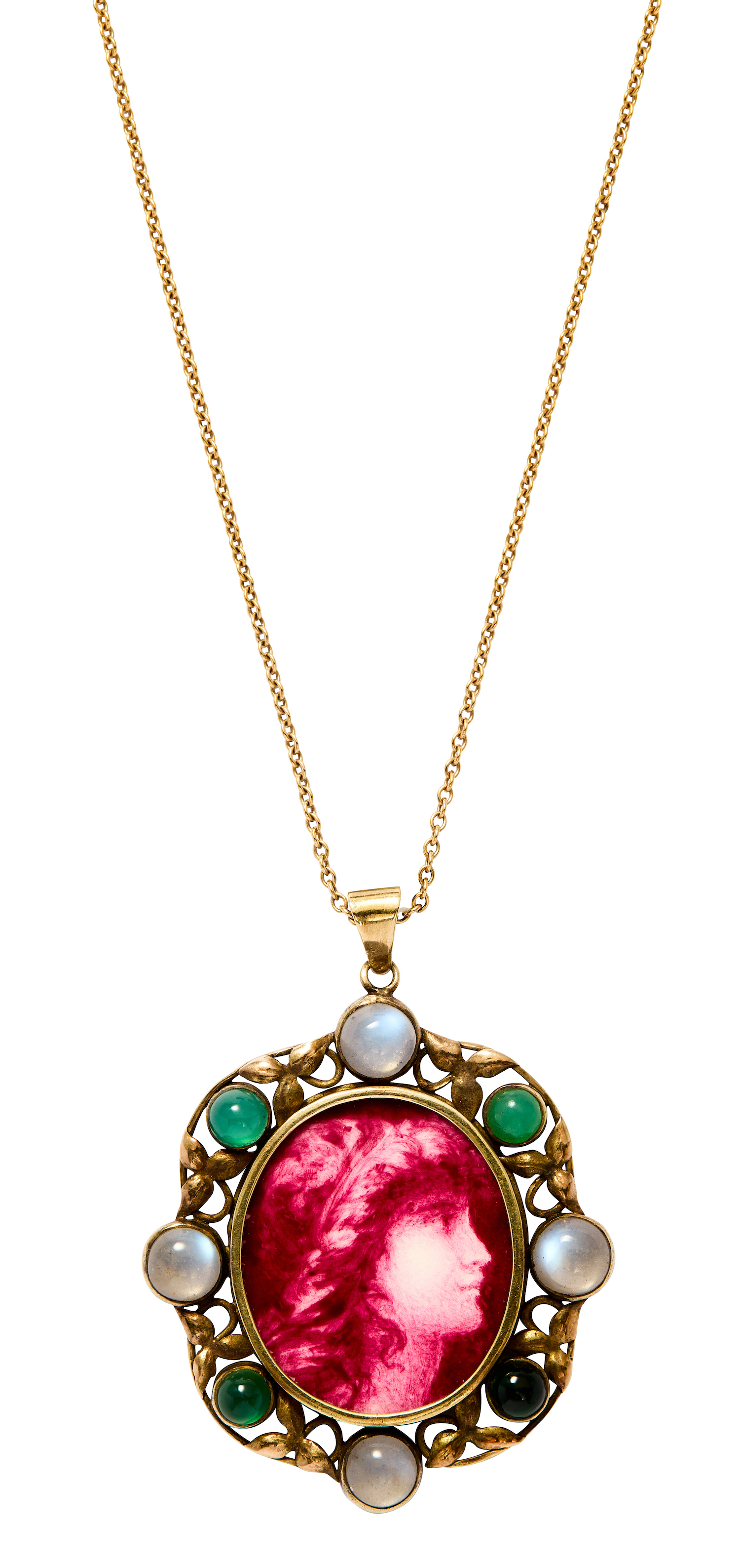 Centring an oval-shaped handpainted porcelain plaque depicting the profile of a female, upon an 18ct gold openwork surround of foliate motif accented with alternating bezel-set round green and white cabochon stones, supported from a 9ct gold fine trace chain, length 43mm, width 33mm, total gross weight approximately 9 grams.