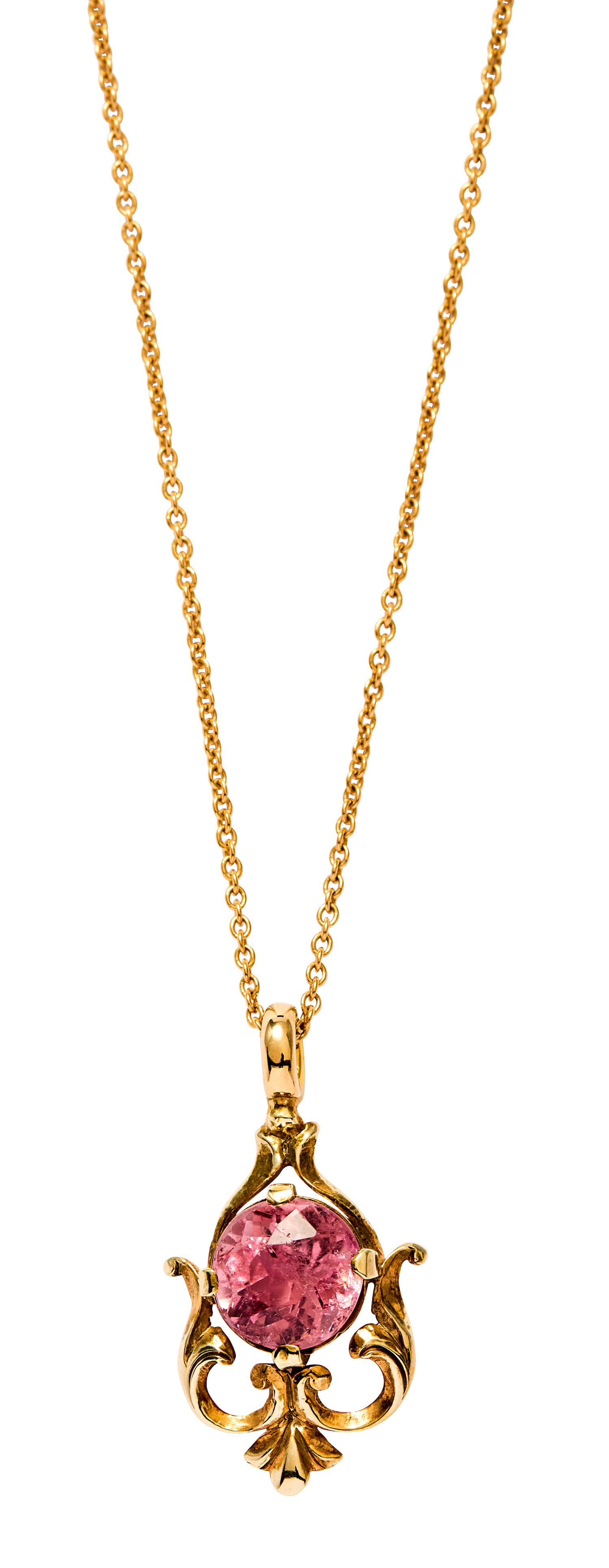 Of foliate design, centring a claw-set pink round-cut tourmaline within a 9ct gold scrolled surround, supported from a 9ct gold trace chain, pendant length 23mm, pendant width 12mm, total gross weight approximately 3 grams.