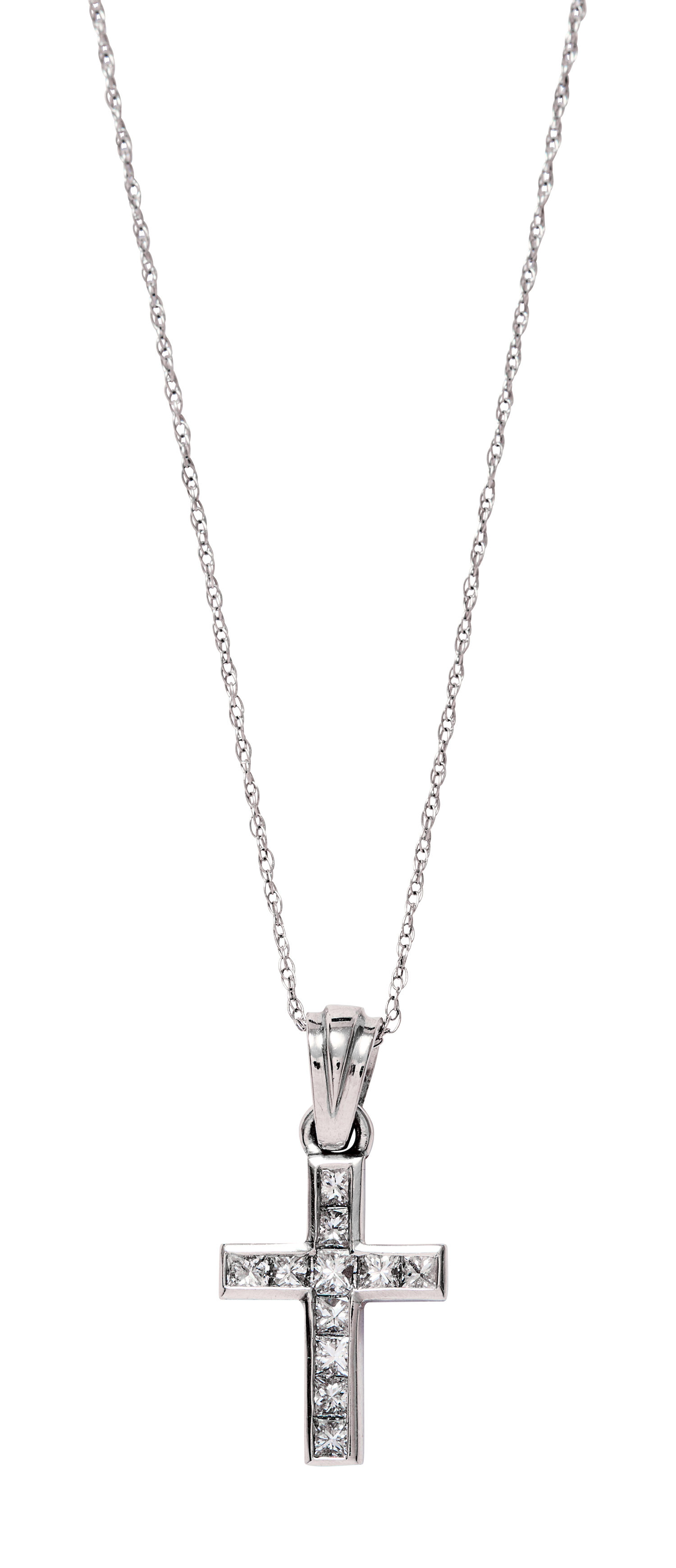 Composed of 11 channel-set princess-cut diamonds together weighing approximately 0.46 carats, supported from a 14ct white gold chain, mounted in platinum, pendant length 20mm, total gross weight approximately 2 grams.