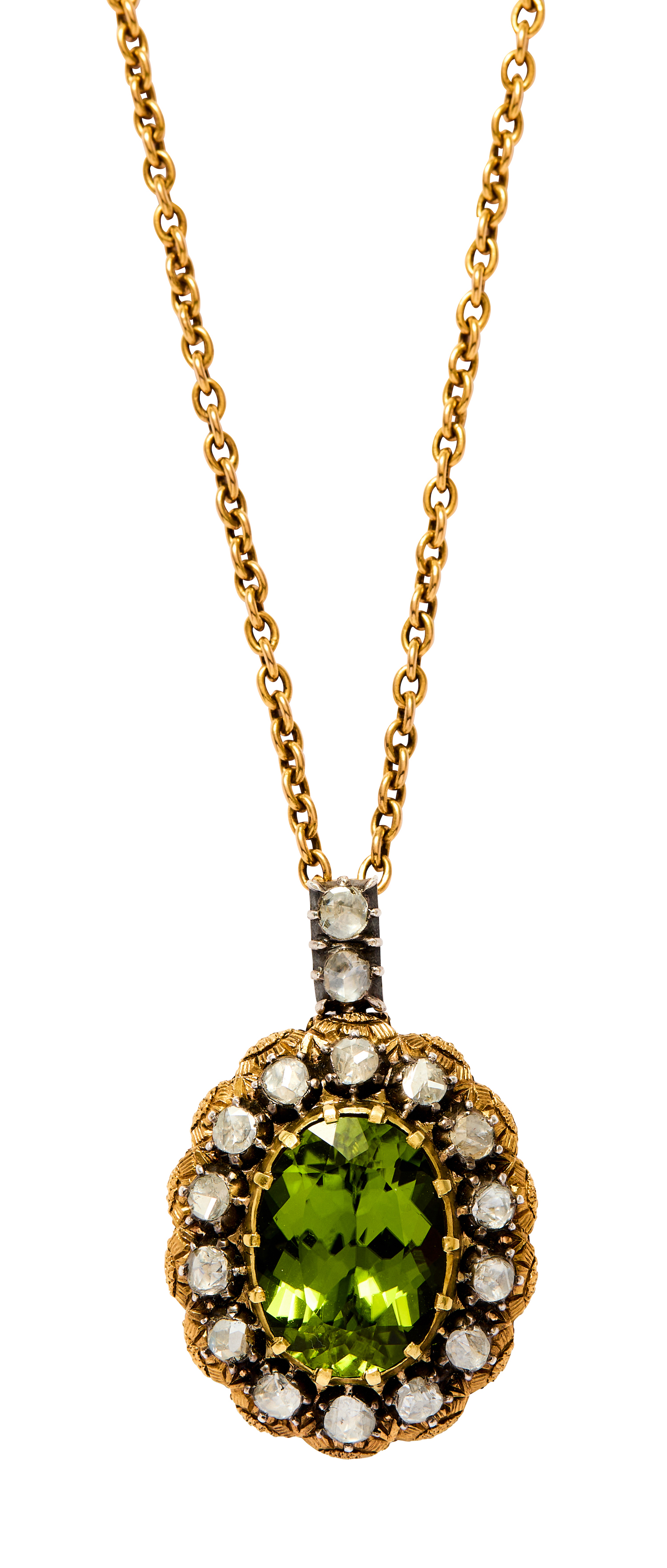 Of cluster design, centring a claw-set oval-shaped mixed-cut peridot weighing approximately 9.75 carats, accented with silver cut-away claw-set rose-cut diamonds upon an 18ct gold surround engraved throughout with floral motif, the fold-down hinged bail set with two further rose-cut diamonds and supported from an 18ct gold trace chain, the diamonds together weighing approximately 1.60 carats, chain length 400mm, pendant length 37mm, pendant width 23mm, total gross weight approximately 20 grams.