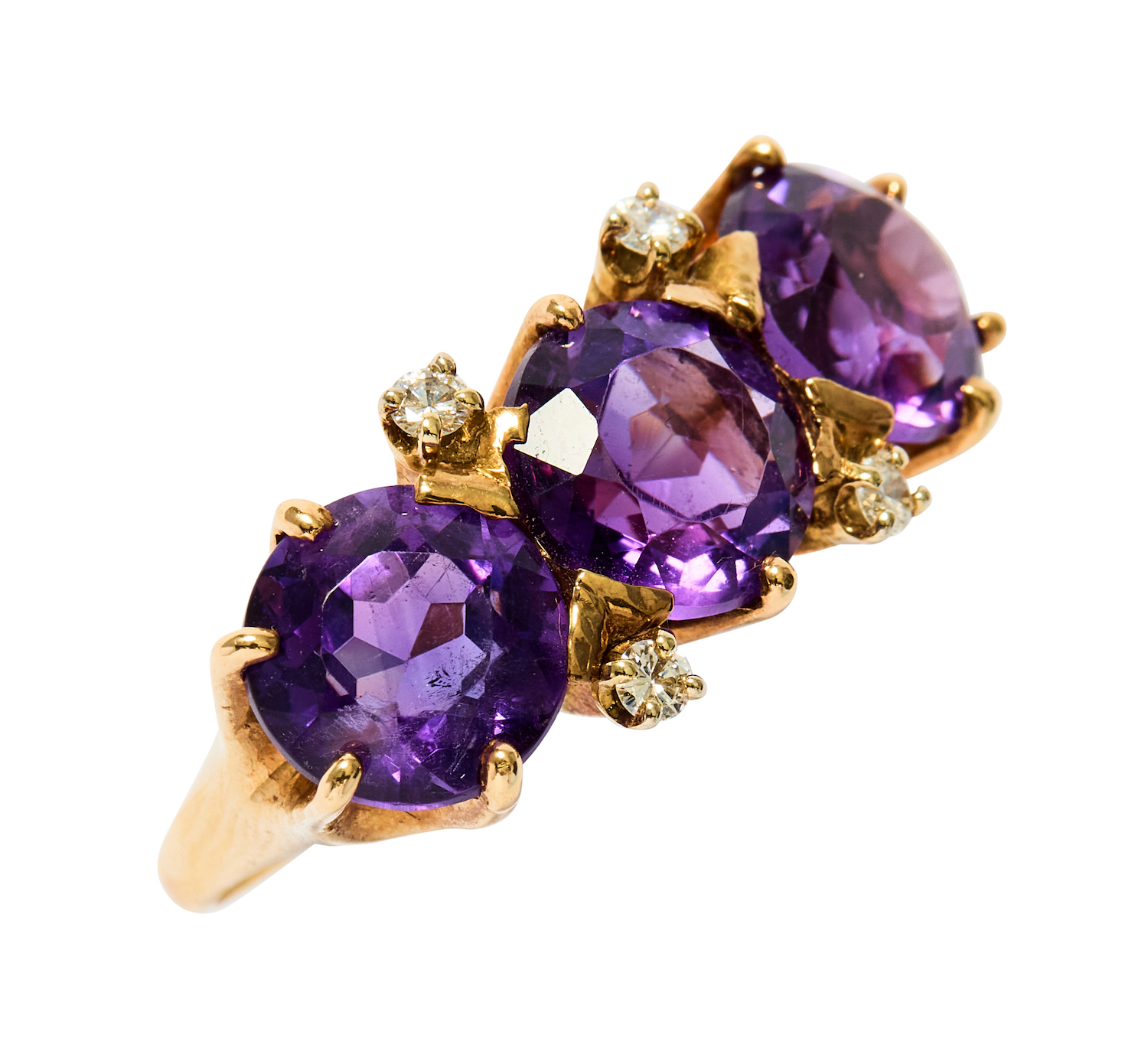 Three claw-set circular-cut amethysts together weighing approximately 4.80 carats, accented with four round brilliant-cut diamonds together weighing approximately 0.12 carats, mounted in 9ct gold, size J, total gross weight approximately 4 grams.
