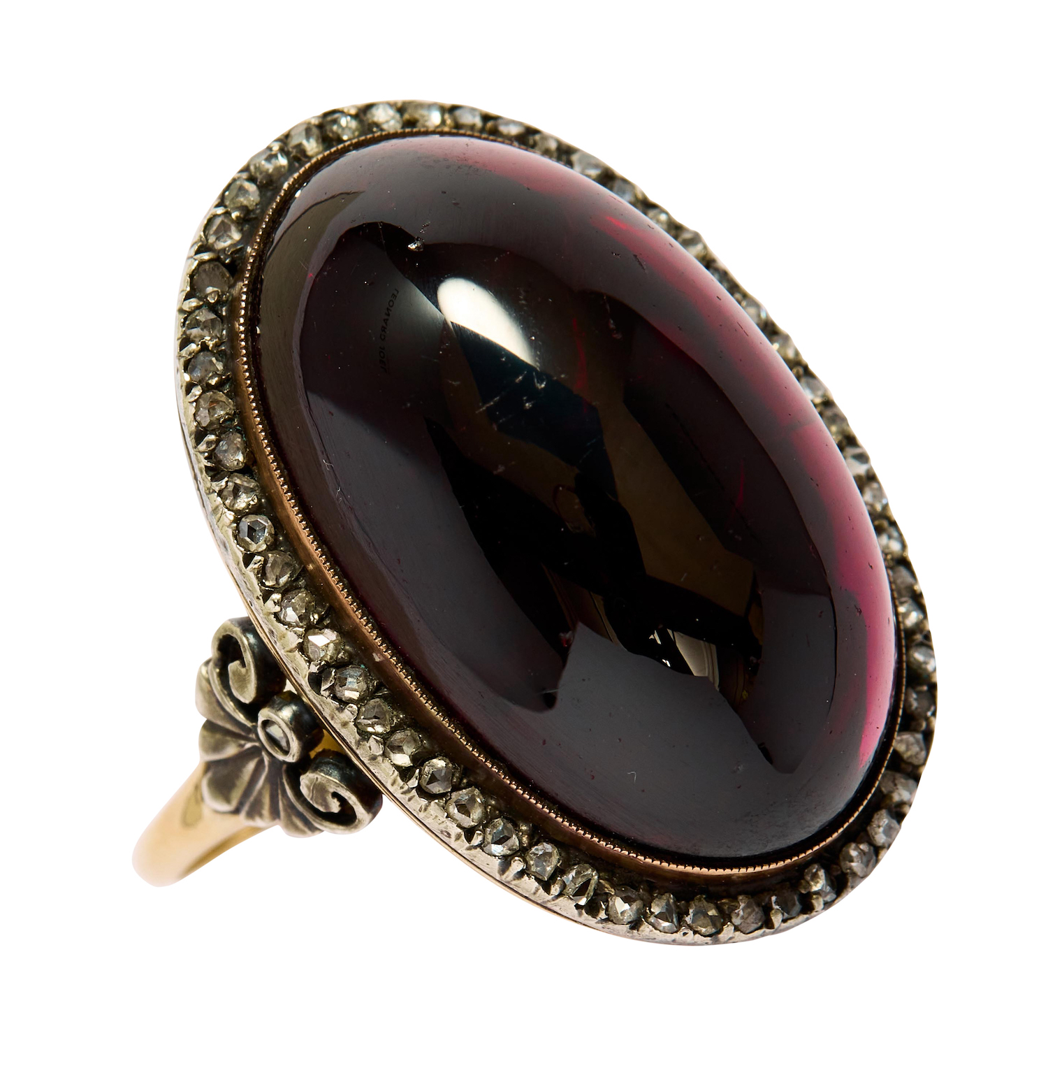 Centring a bezel-set cabochon almandine garnet weighing approximately 26.55 carats, accented with old rose-cut diamonds to the surround and scrolled shoulders, the diamonds together weighing approximately 0.30 carats, mounted in 18ct gold and silver, size S, total gross weight approximately 15 grams.
