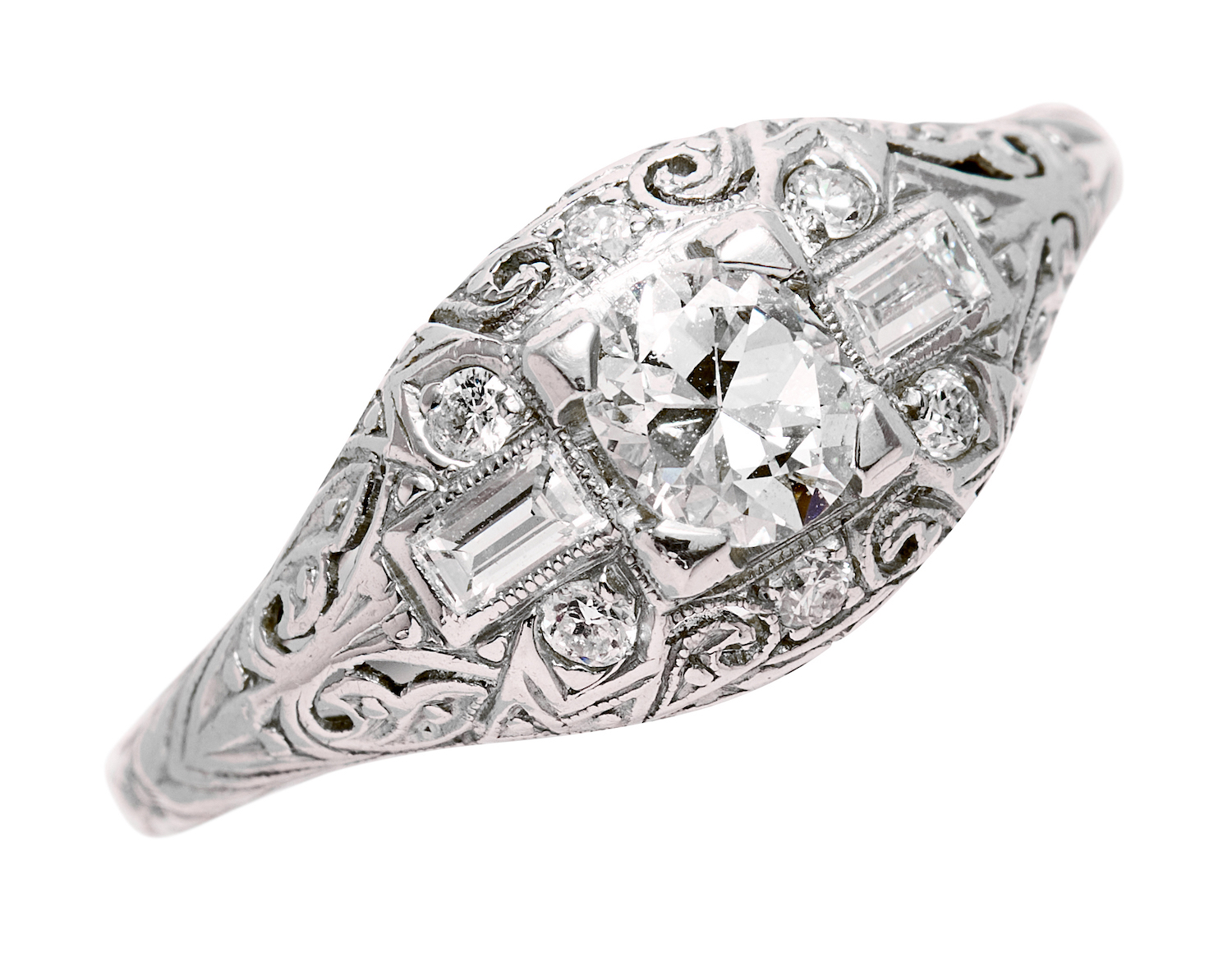 Centring a claw-set round brilliant-cut diamond weighing approximately 0.51 carats, flanked by a pair of bezel-set baguette diamonds upon an engraved top accented with round brilliant-cut diamonds, mounted in platinum, size R1/2, total gross weight approximately 3 grams.