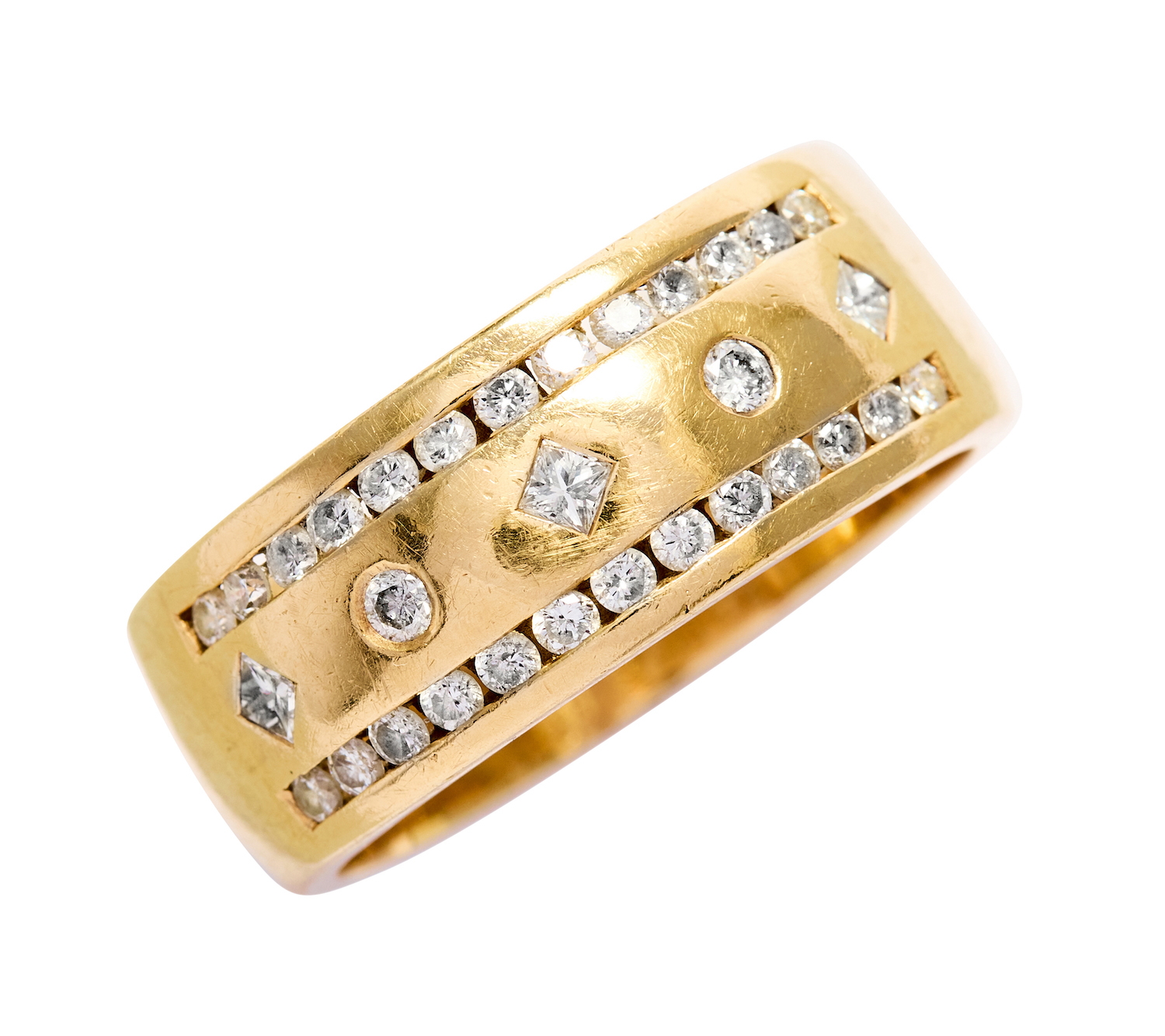 The wide band composed of a row of alternating hammer-set princess-cut and round brilliant-cut diamonds between two rows of channel-set round brilliant-cut diamonds, the diamonds together weighing approximately 1.32 carats, mounted in 14ct gold, size Z, total gross weight approximately 12 grams.
