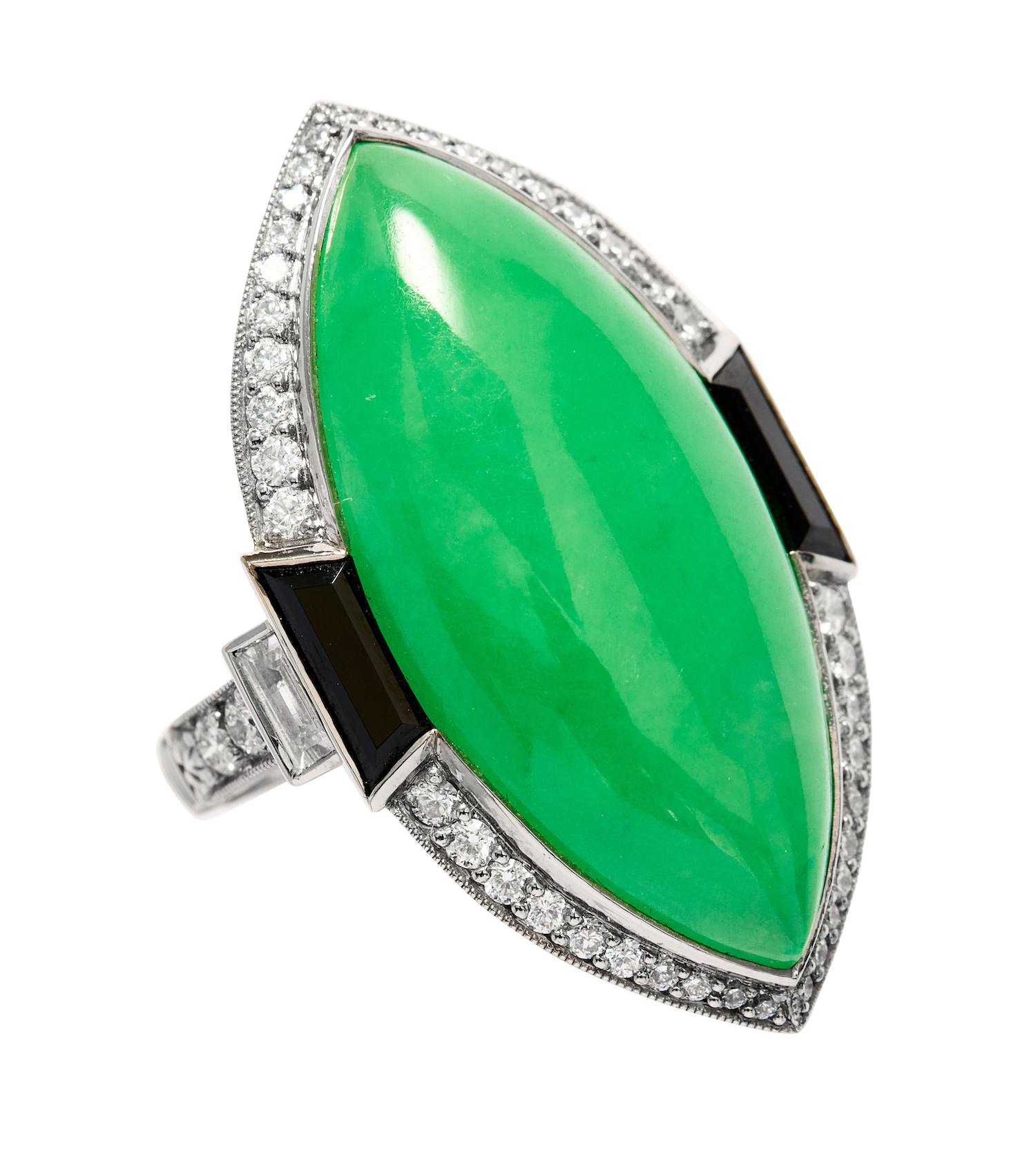 Of cluster design, centring a bezel-set marquise-shaped cabochon green jadeite weighing approximately 22.96 carats, flanked by a pair of trapeze-cut black spinel and baguette diamonds, accented with round brilliant-cut diamonds to the surround and shoulders, the diamonds together weighing approximately 0.78 carats, mounted in 18ct white gold, size M1/2, total gross weight approximately 15 grams.