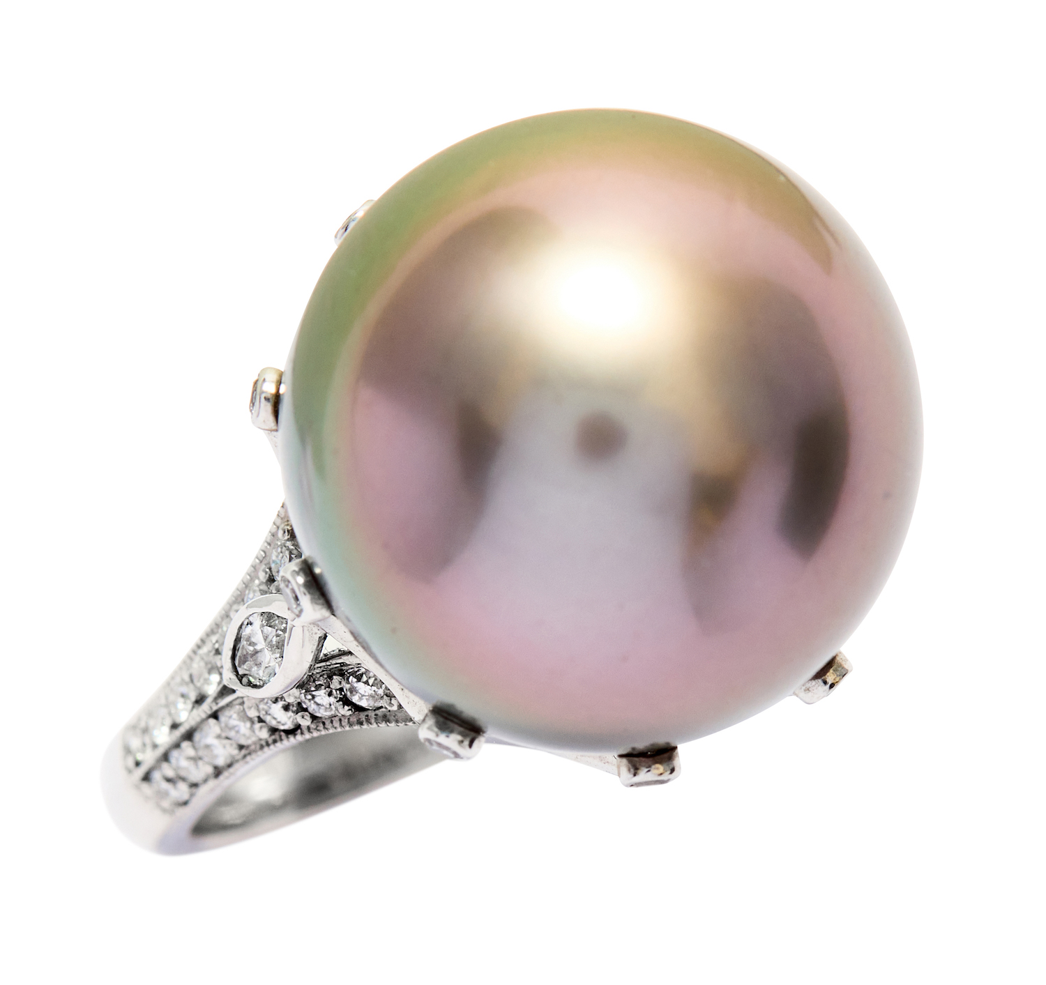 In our opinion, the cultured pearl is of grey bodycolour with with a variation of green, olive and lavender overtones. Pitting, indents and wrinkles to the nacre. Good luster, some minor scratches to the surface. The small diamonds are bright and lively probably of F/G colour and VS clarity as gauged and graded within the limitations of the cutting style and the mounting. The mounting has wear to the metal in the form of minor scratches.
