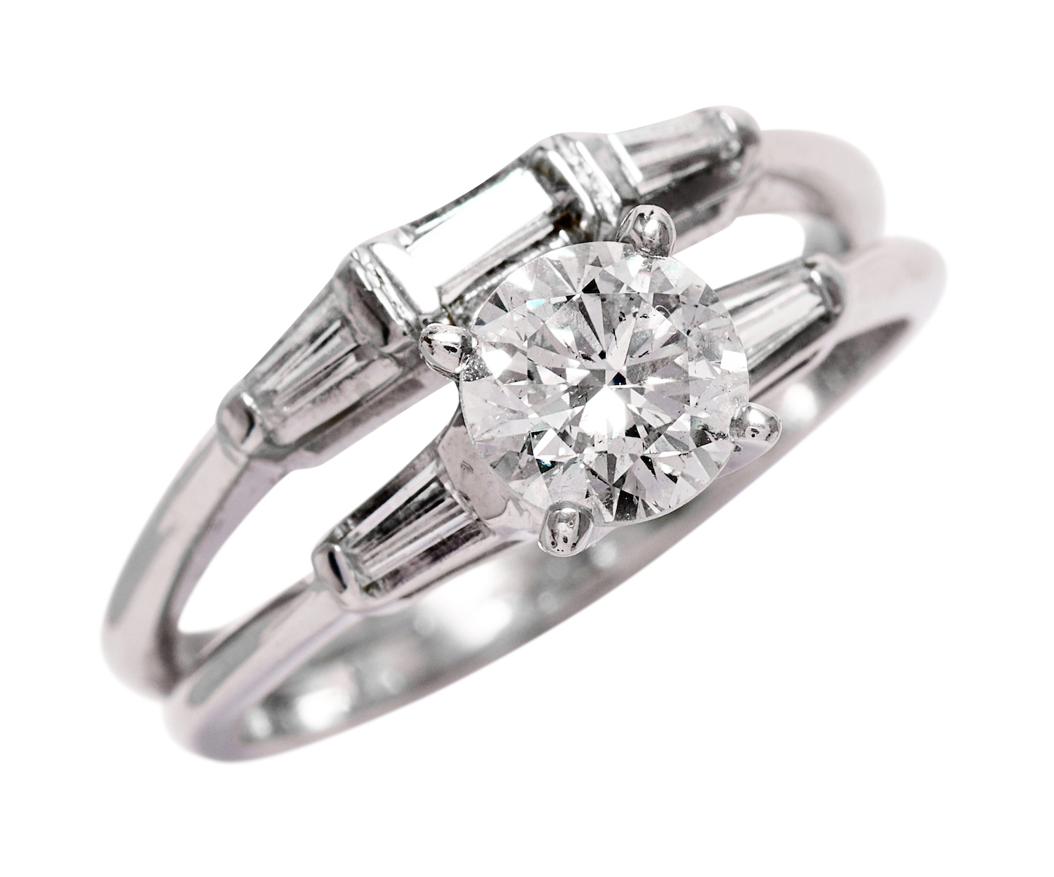 Of split shank design, centring a claw-set round brilliant-cut diamond weighing approximately 0.81 carats, flanked by a pair of end-set tapered baguette diamonds, the adjacent band composed of a further three end-set baguette diamonds together weighing approximately 0.20 carats, mounted in 14ct white gold, size K1/2, total gross weight approximately 4 grams.