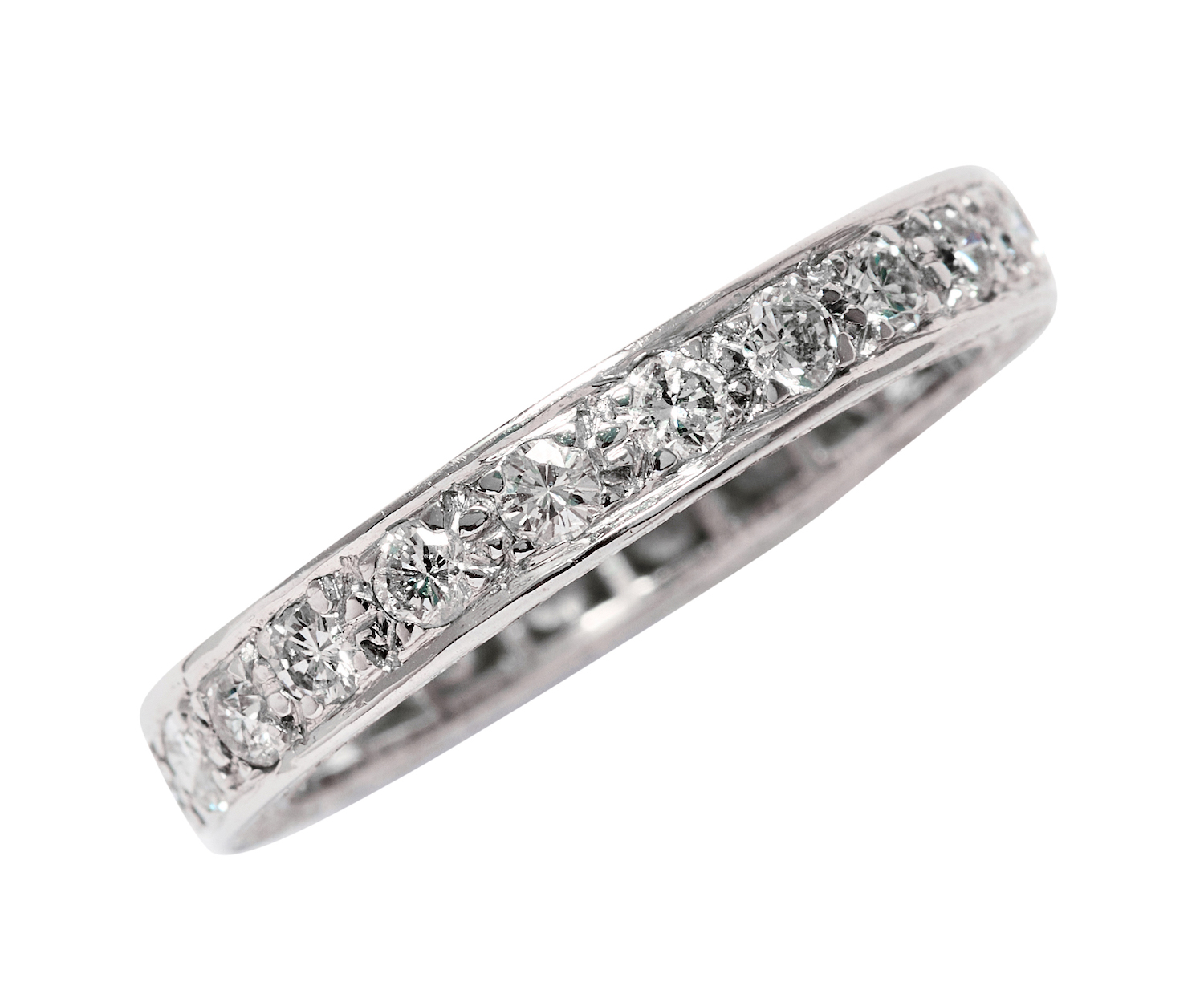 Designed as a continuous row of 22 bead-set round brilliant-cut diamonds together weighing approximately 1.10 carats, the band with engraved profiles, mounted in 18ct white gold, size O, total gross weight approximately 5 grams.