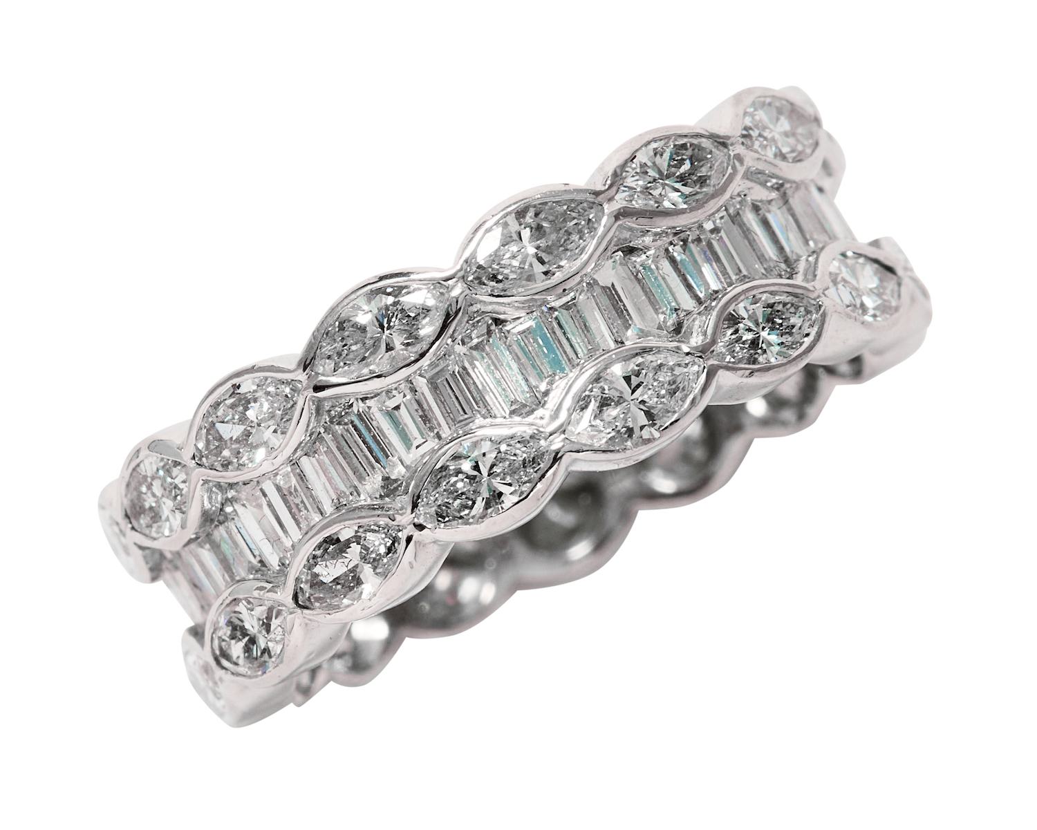 Centring a continuous line of channel-set baguette diamonds flanked by rows of bezel-set marquise-shaped diamonds weighing approximately 1.75 carats and 2.10 carats respectively, mounted in 18ct white gold, size M, total gross weight approximately 6 grams.