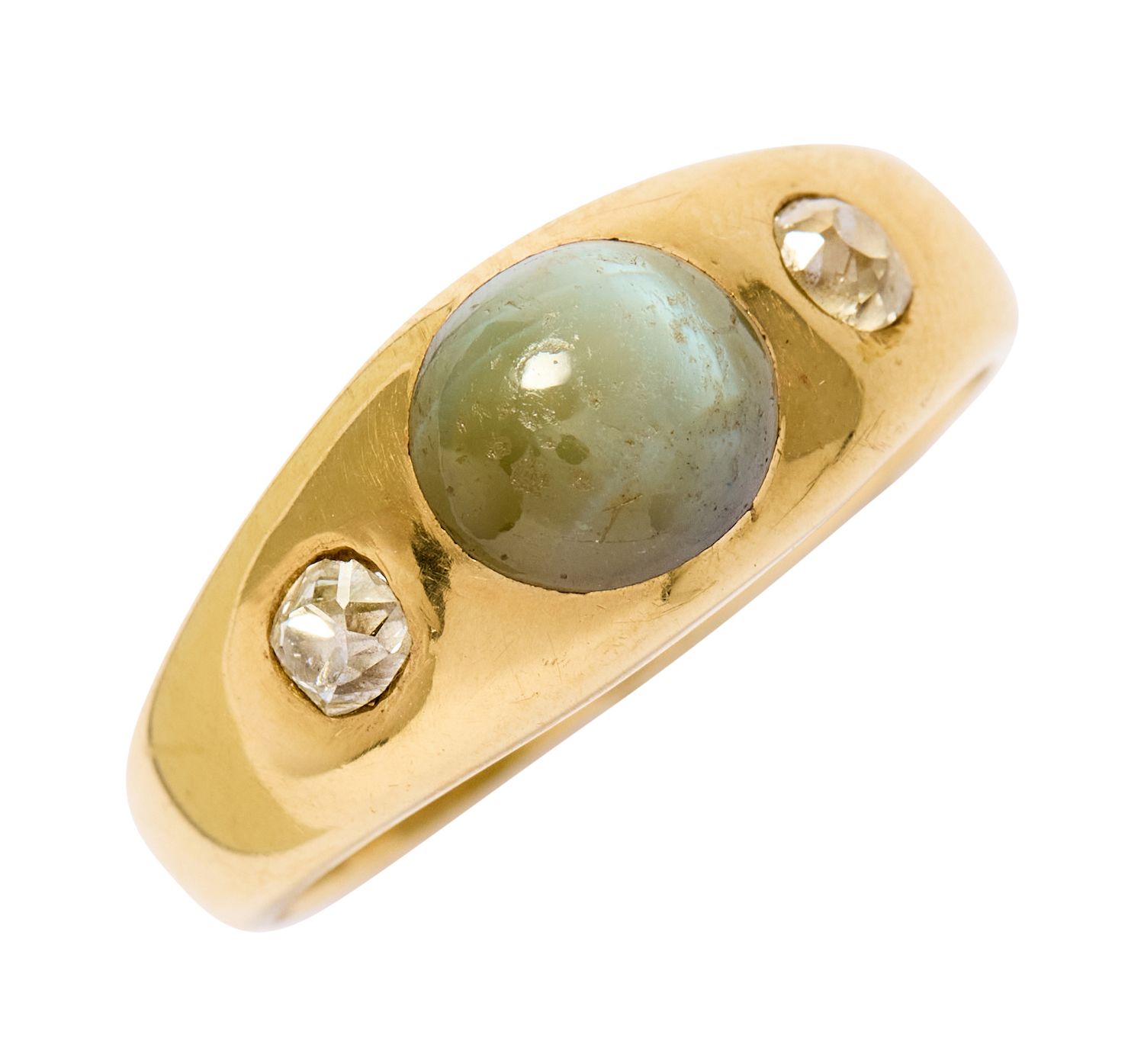 Of sculptured band design, centring a rubover-set green chrysoberyl cat's eye weighing approximately 2.40 carats, between two old mine-cut diamonds together weighing approximately 0.32 carats, mounted in 18ct gold, size Q, total gross weight approximately 7 grams.