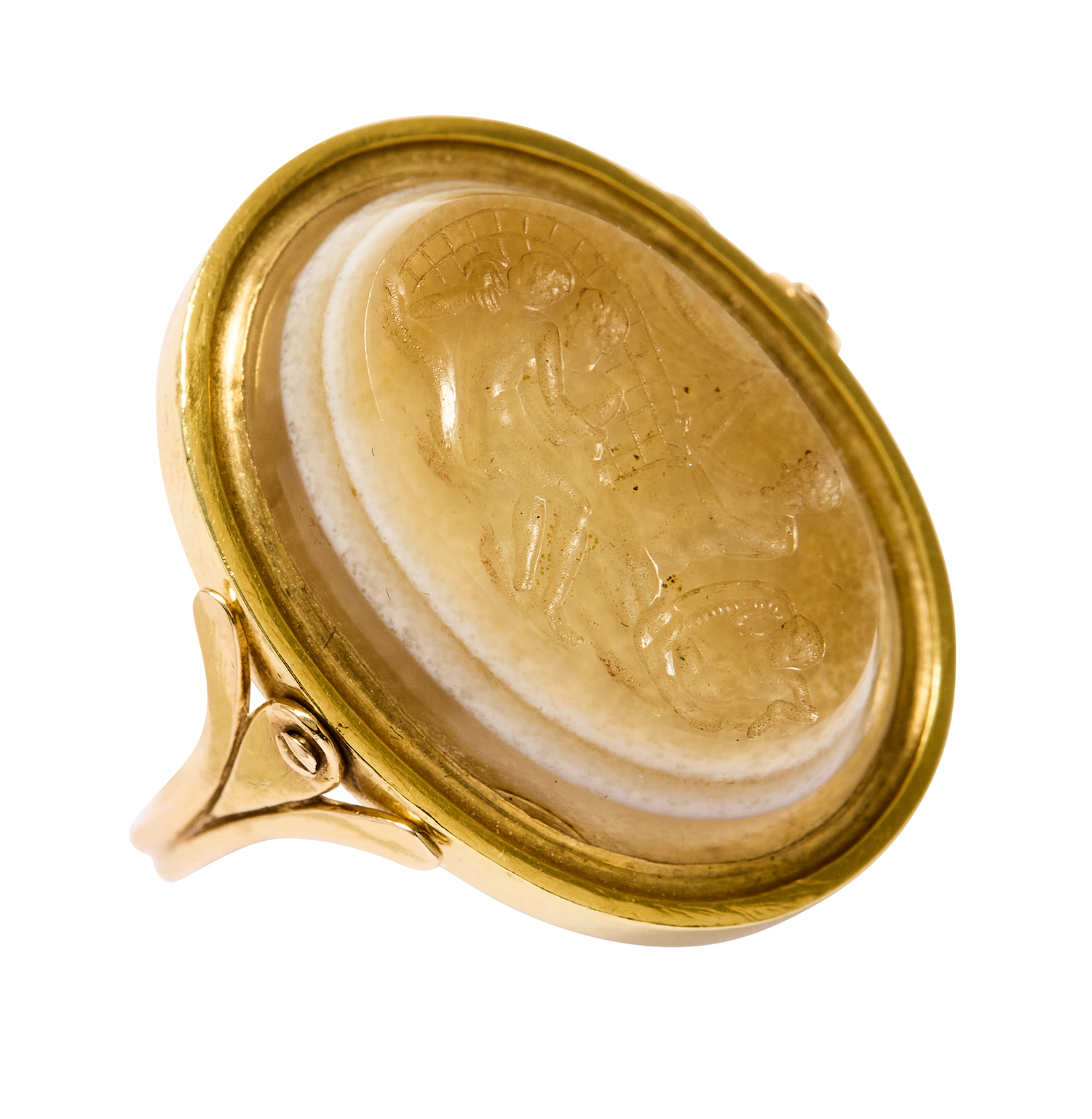 Centring a framed carved banded agate depicting a scene with neoclassical nude male figures, upon a swivel band, mounted in 18ct gold, size U, total gross weight approximately 6 grams.