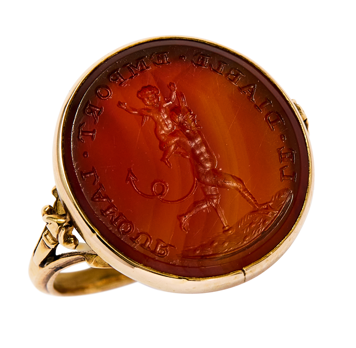 Centring a carved carnelian depicting the Devil carrying away Cupid, engraved 'LE DIABLE EMPORT L'AMOUR', mounted in 9ct gold, size M, total gross weight approximately 3 grams.