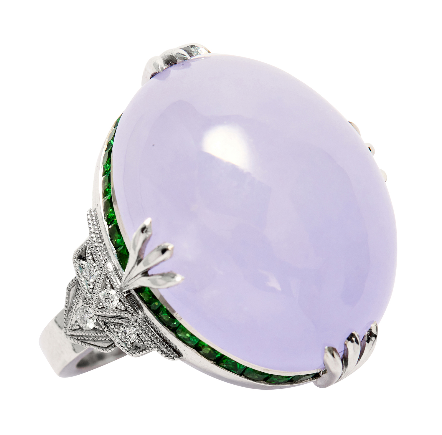 Centring a split claw-set oval cabochon lavender jadeite measuring approximately 22mm by 18mm by 10mm and weighing approximately 36.70 carats, surmounting a row of channel-set square-cut tsavorite garnets, to shoulders accented with millegrain bead-set round brilliant-cut diamonds, the tsavorites and diamonds together weighing approximately 1.60 carats and 0.09 carats respectively, mounted in 18ct white gold, size N, total gross weight approximately 19 grams.