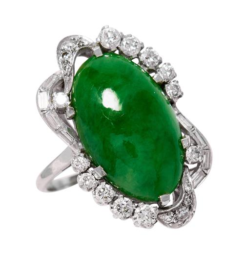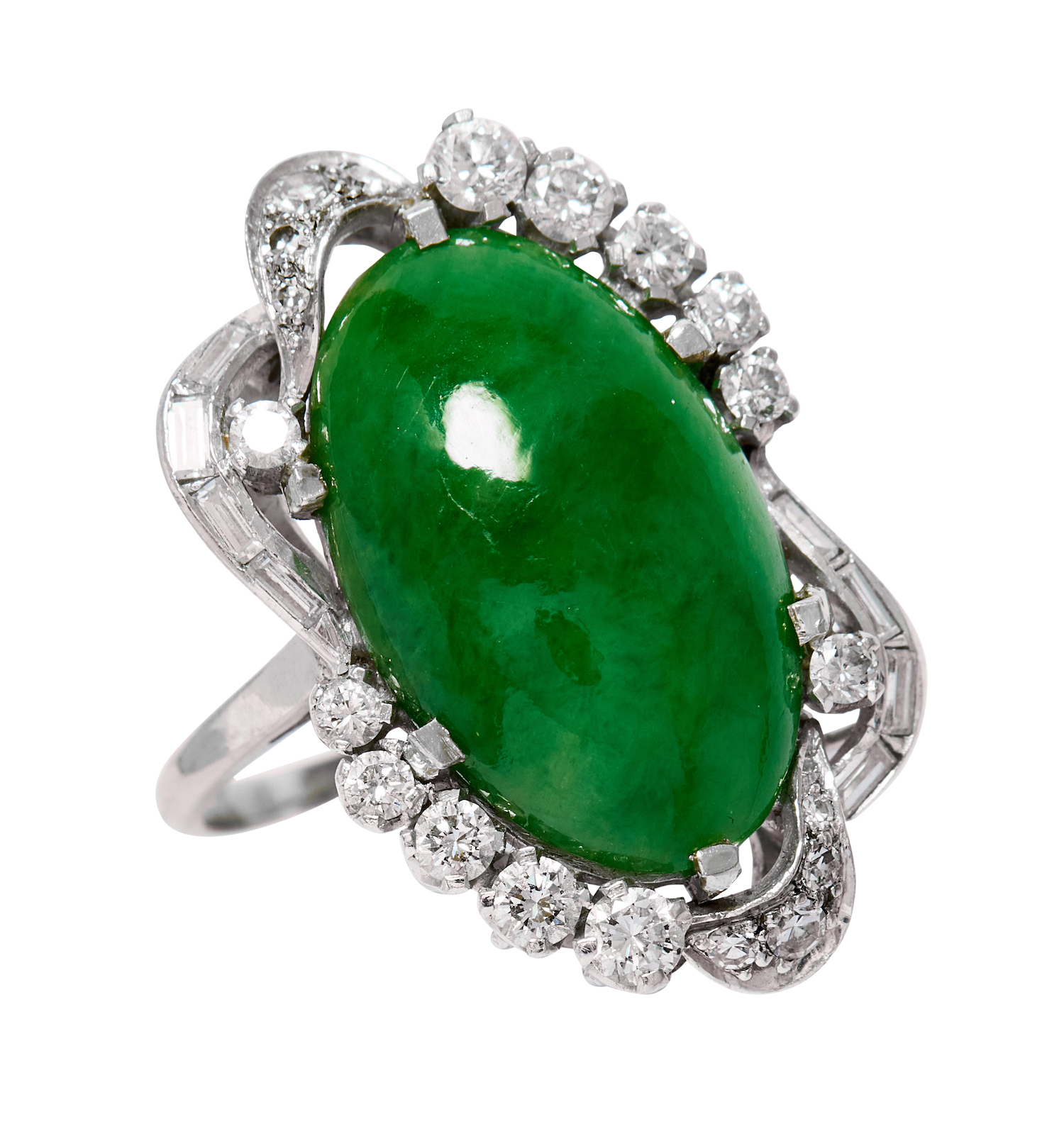 Of cluster design, set with an oval-shaped cabochon green jadeite weighing 9.56 carats, accented with round brilliant-cut, single-cut and baguette diamonds together weighing approximately 0.82 carats, mounted in platinum and 15ct white gold, size N1/2, total gross weight approximately 9 grams.