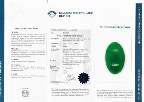 Accompanied by a GSL report numbered AA60100/2, dated 19 February 2018, stating that the 9.56 carat Type A jadeite is natural, with no indications of enhancement.