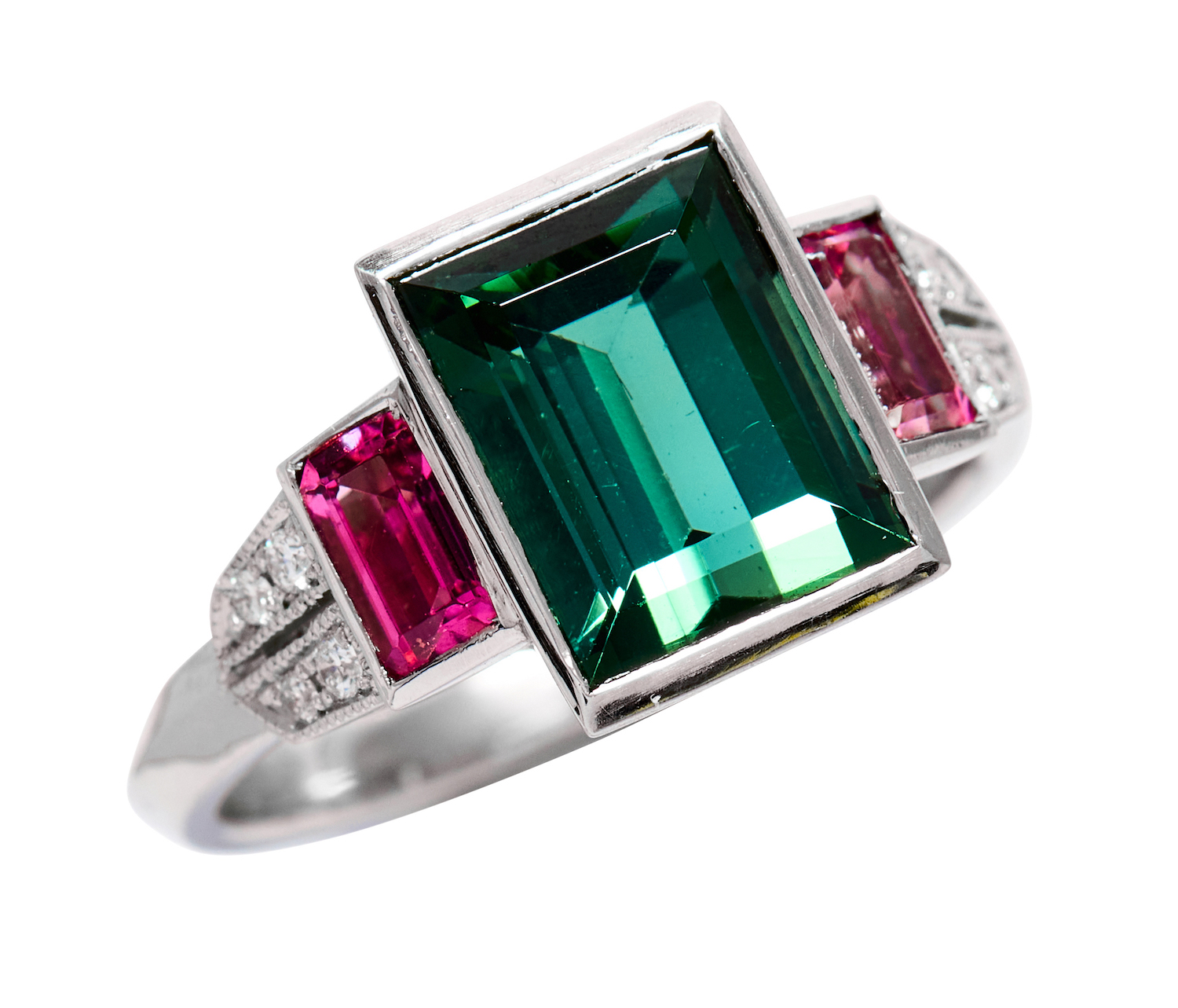In our opinion, the centre tourmaline is deep slightly bluish green, eye-clean to slightly included, with some minor nicks along the facet junctions and a few scratches noticeable upon close inspection. The side tourmalines are of mid pink colour with strong saturation with typical inclusions, well matched. The smaller diamonds are bright and lively probably of F/G colour and SI clarity as gauged and graded within the limitations of the cutting style and the mounting. The mounting has wear to the metal in the form of minor scratches.