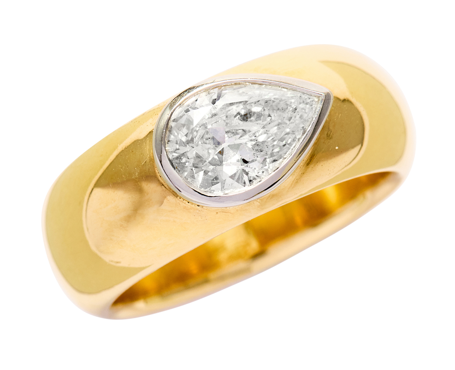 Centring a bezel-set pear-shaped diamond weighing approximately 1.07 carats, mounted in 18ct gold and platinum, size M1/2, total gross weight approximately 14 grams.