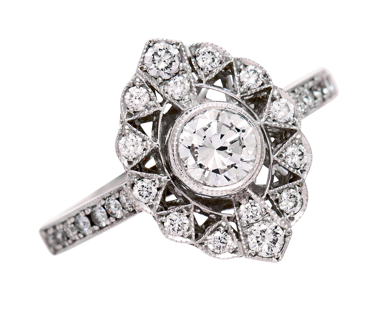 Of elliptical plaque design, centring a millegrain bezel-set round brilliant-cut diamond weighing approximately 0.42 carats, accented with a further 28 round brilliant-cut diamonds bead-set in the surround and to the shoulders, together weighing approximately 0.36 carats, mounted in 18ct white gold, size L1/2, total gross weight approximately 5 grams.