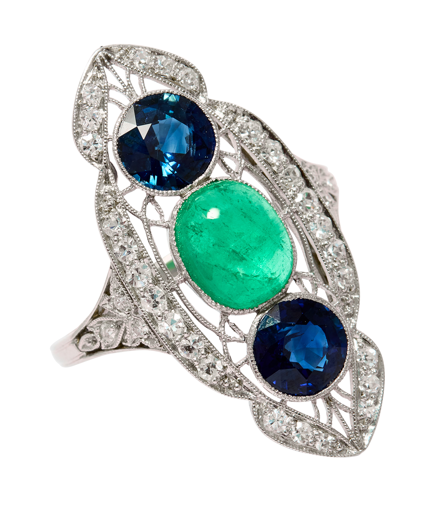 Of pierced plaque design, centring a millegrain bezel-set oval-shaped cabochon emerald weighing approximately 2.05 carats, flanked by a pair of mixed-cut sapphires together weighing approximately 2.20 carats, within a diamond surround, mounted in platinum, size O, total gross weight approximately 7 grams.