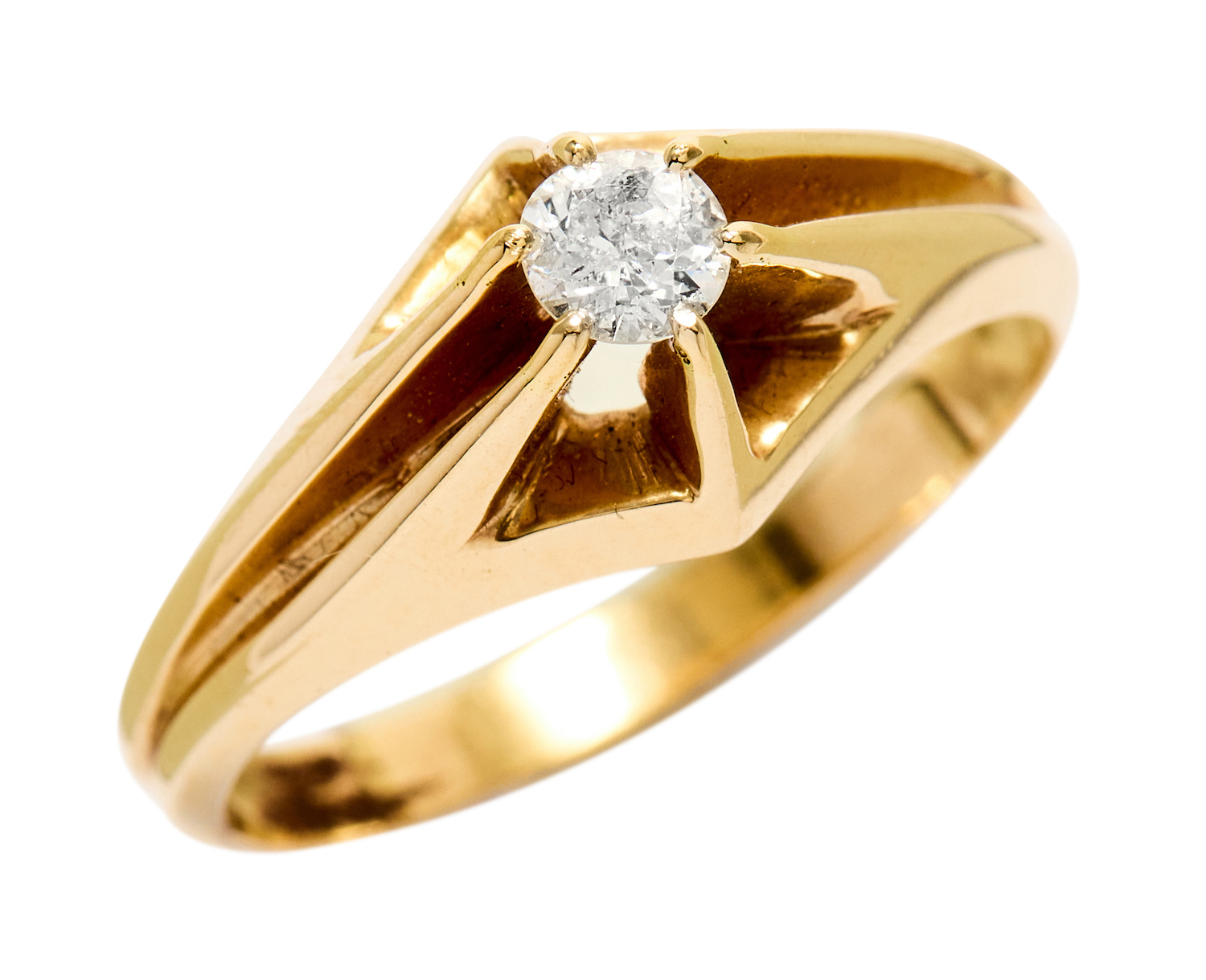 Centring a high claw-set old European brilliant-cut diamond weighing approximately 0.22 carats, to tapered shoulders and shank with continuous central recess, mounted in 14ct gold, size R1/2, total gross weight approximately 4 grams.