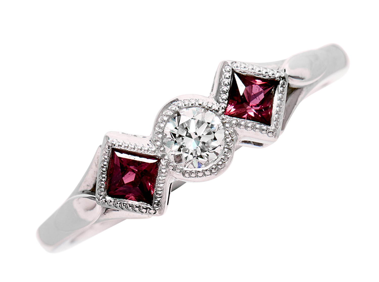 Centring a millegrain-set round brilliant-cut diamond weighing approximately 0.17 carats, flanked by a pair of princess-cut rubies together weighing approximately 0.29 carats, mounted in 18ct white gold, size L, total gross weight approximately 4 grams.