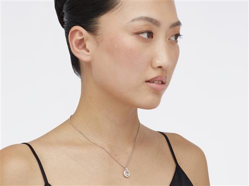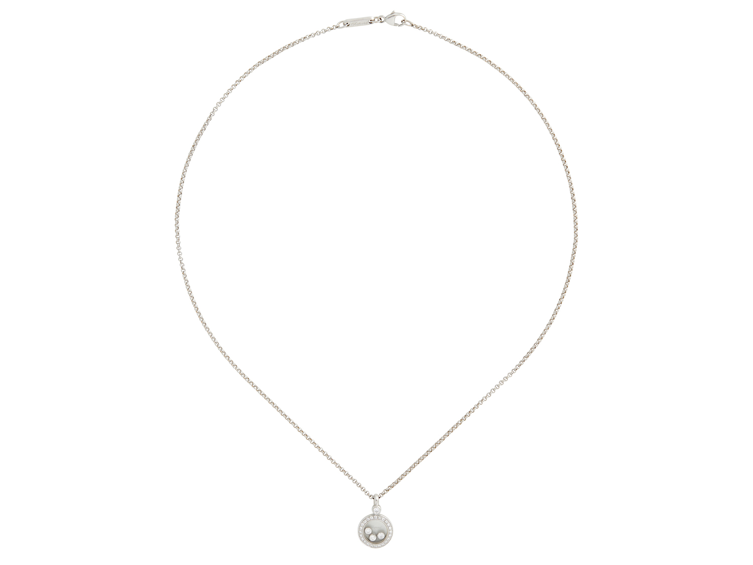 Comprising a circular glazed compartment framed by brilliant-cut diamonds and enclosing three floating collet-set diamonds, the diamonds together weighing approximately 0.24 carats, to a fine belcher link chain completed by a parrot clasp,