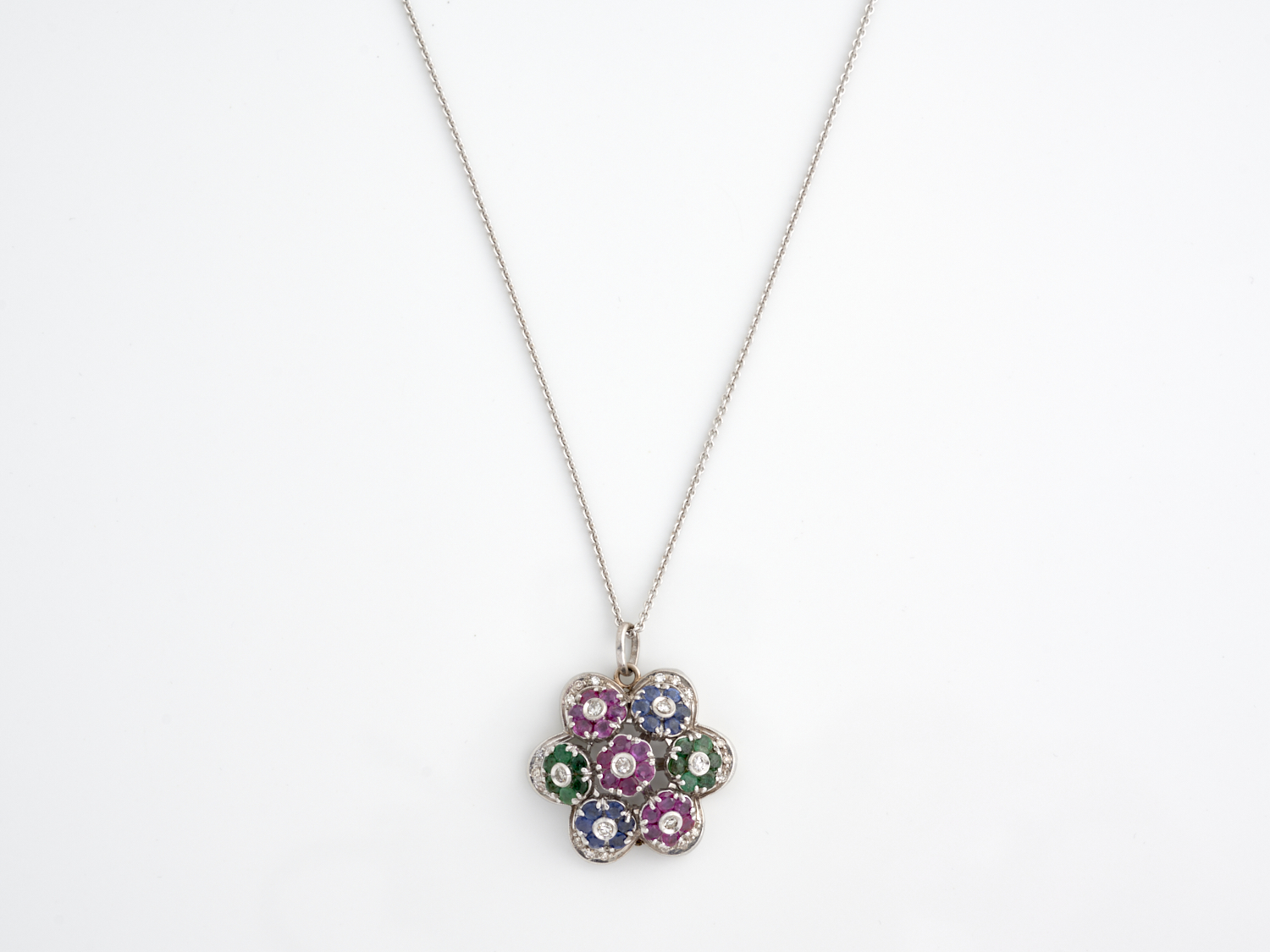 A SAPPHIRE, DIAMOND, EMERALD AND RUBY SET EN TREMBLANT PENDANT NECKLACE IN 18CT WHITE GOLD, PENDANT LENGTH 32MM, NECKLACE LENGTH 440MM, 17.5GMS