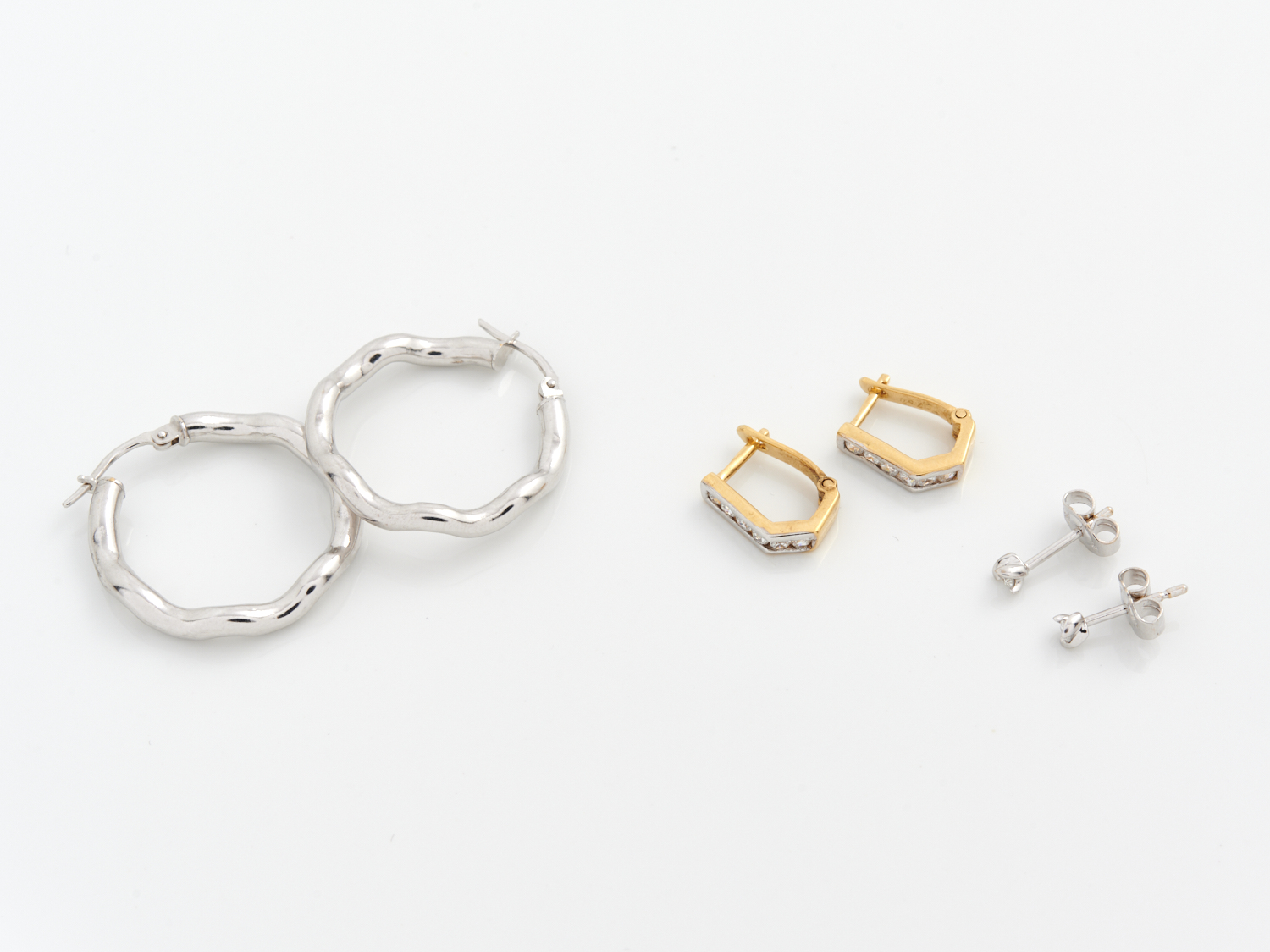 THREE PAIRS OF EARRINGS IN 18CT WHITE GOLD AND YELLOW GOLD RESPECTIVELY, INCLUDING A PAIR OF DIAMOND STUD EARRINGS, A PAIR DIAMOND HUGGIE EARRING AND A PAIR OF HOOP EARRINGS, 7.5GMS