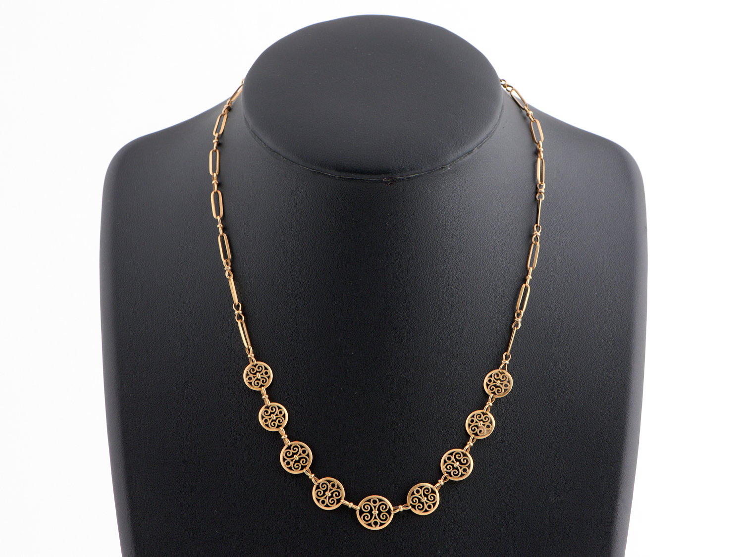 AN ANTIQUE NECKLACE IN 18CT GOLD, RETAILED BY KESHETT, ACCOMPANIED BY VALUATION FOR INSURANCE, LENGTH 440MM, 9.39GMS