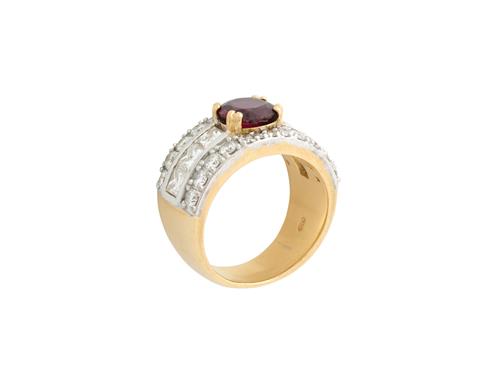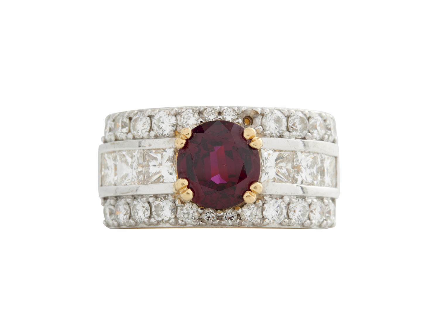 Claw-set with a circular-cut ruby weighing approximately 2.20 carats, flanked by channel-set princess-cut diamonds, within a brilliant-cut diamond border, the diamonds together weighing approximately 1.60 carats, Size N-O.