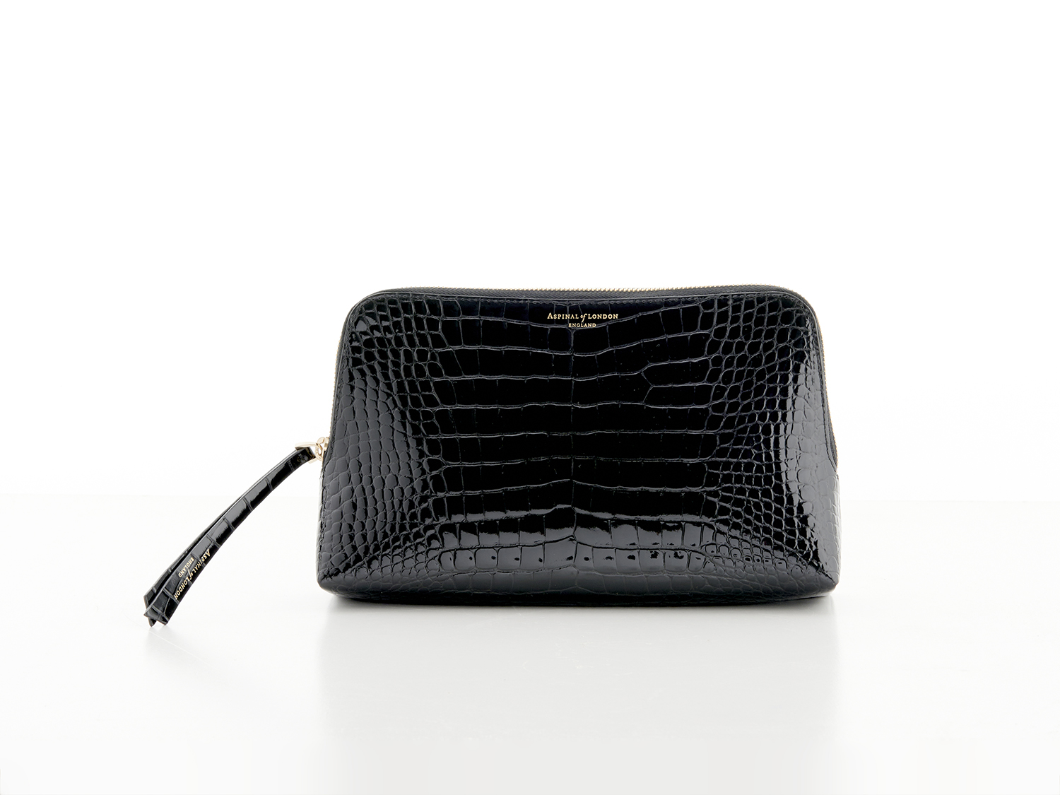 ASPINAL OF LONDON, A COSMETIC POUCH IN PATENT CROC PRINT LEATHER, 25 x 15 x 6cm.
