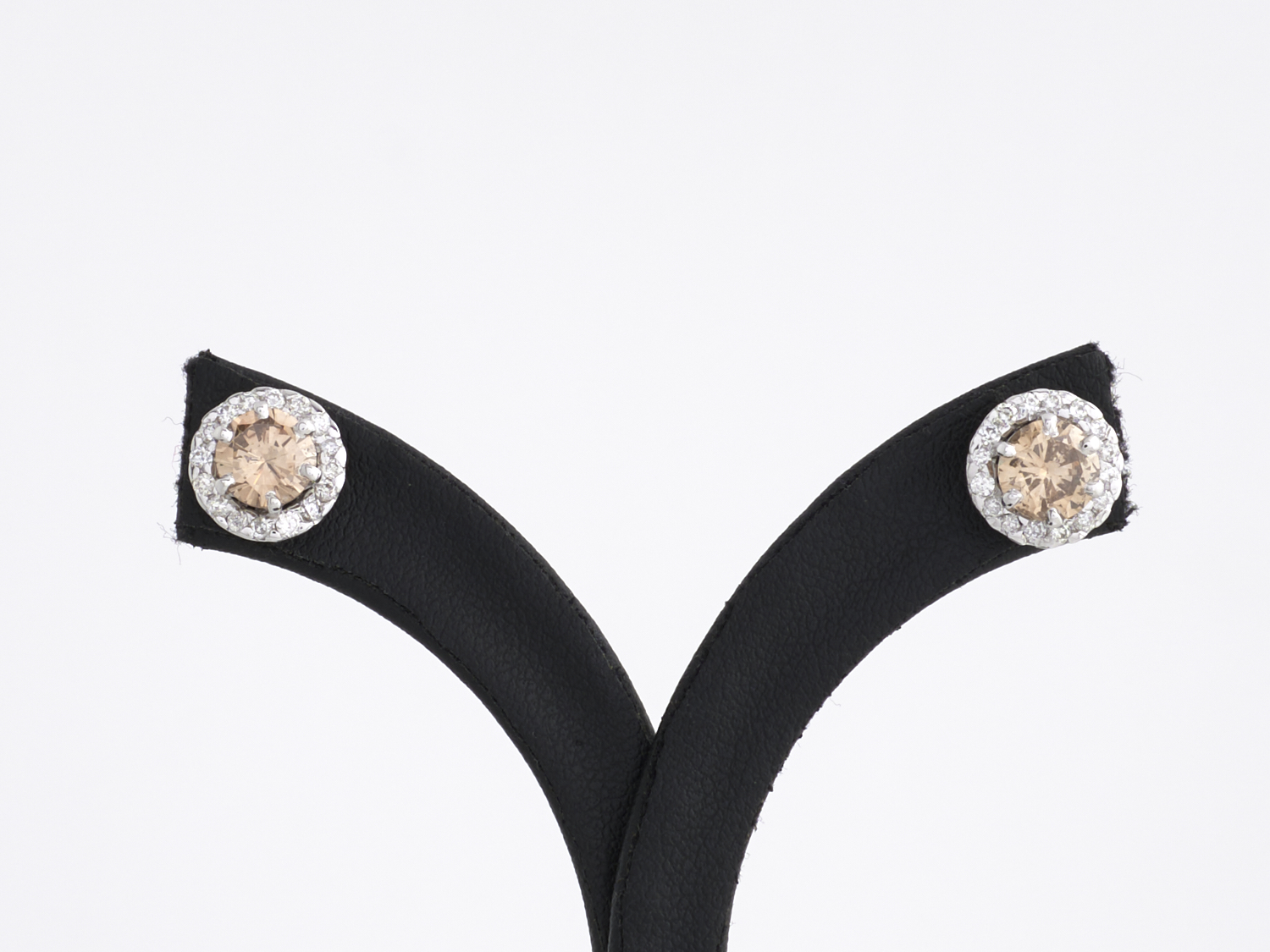 A PAIR OF DETACHABLE COGNAC DIAMOND STUD EARRINGS IN 18CT WHITE GOLD WEIGHING APPROXIMATELY 1.92CTS, WITH HALO DIAMONDS WEIGHING APPROXIMATELY 0.36CTS, TO POST AND BUTTERFLY FITTINGS, ACCOMPANIED BY A VALUATION
