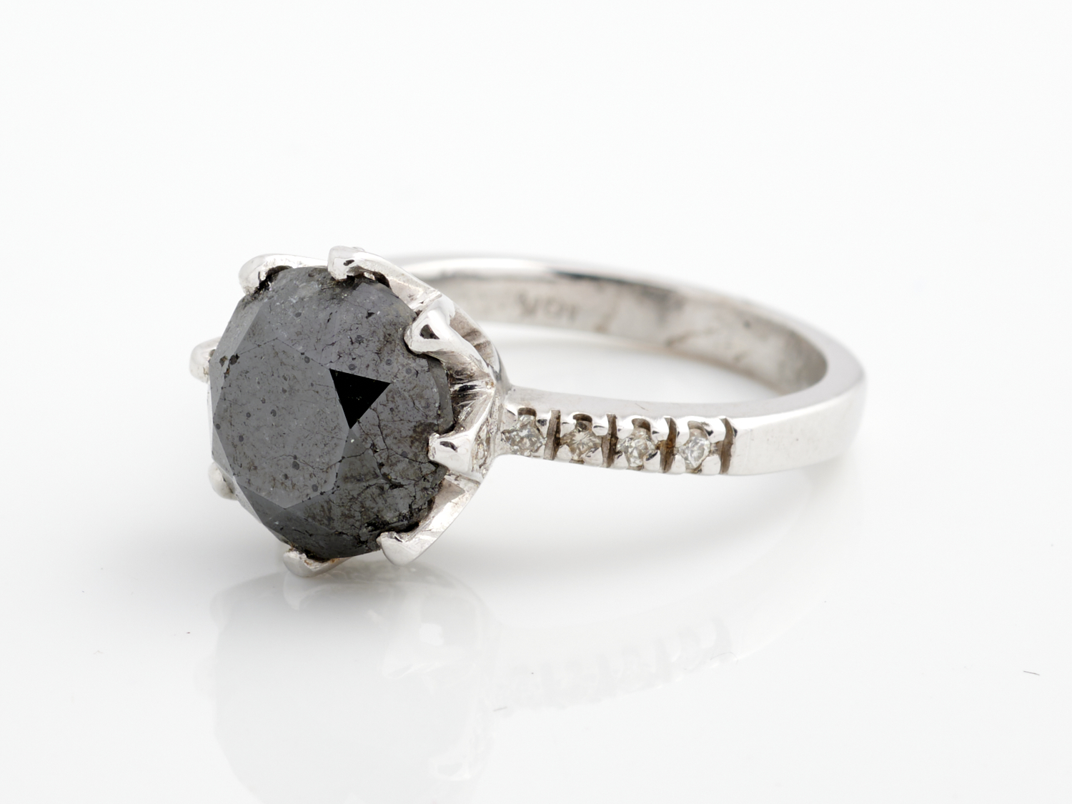 A BLACK DIAMOND AND DIAMOND RING IN 18CT WHITE GOLD, RING SIZE K, 4.8GMS