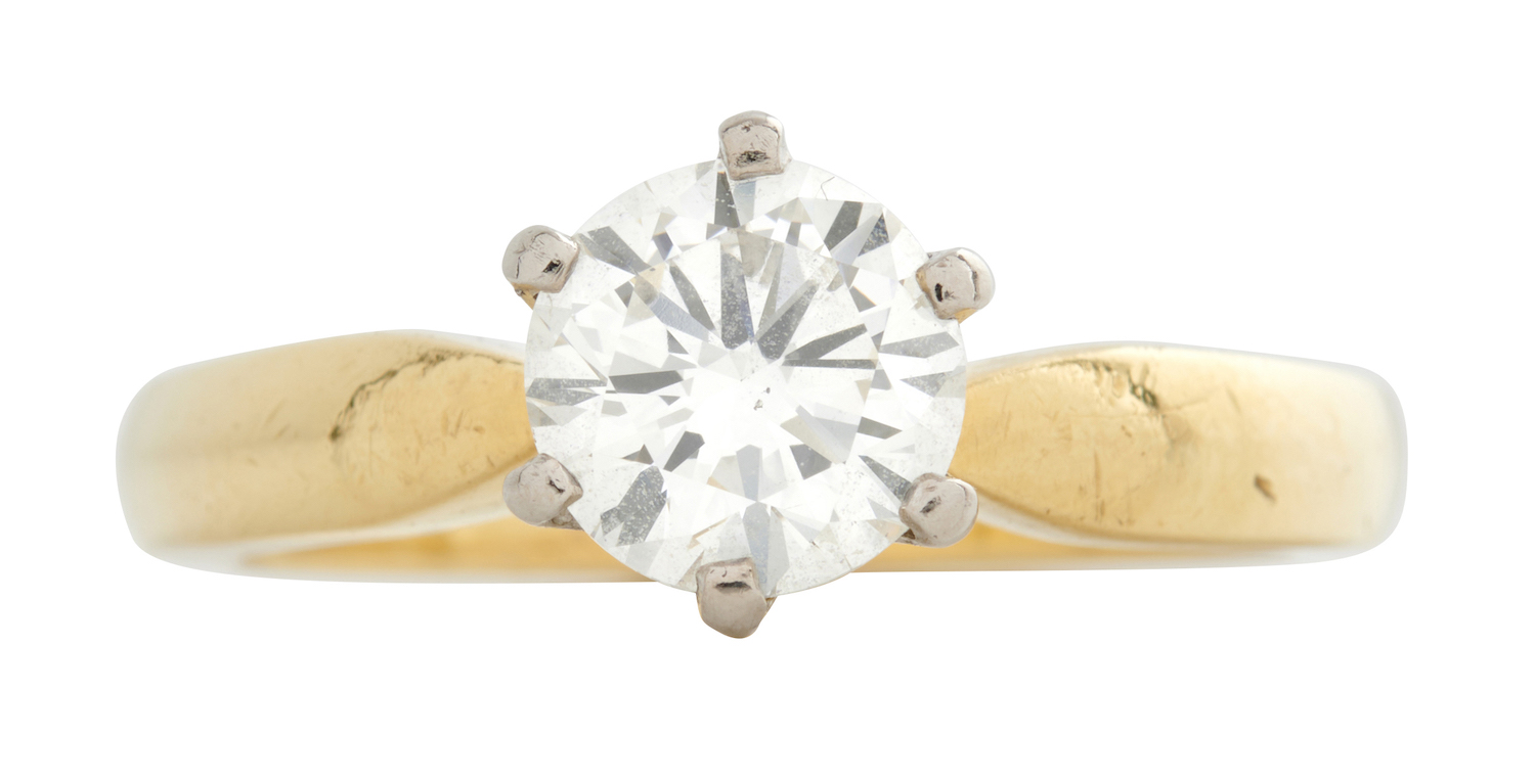 Claw-set with a brilliant-cut diamond weighing approximately 1.06 carats, size M.