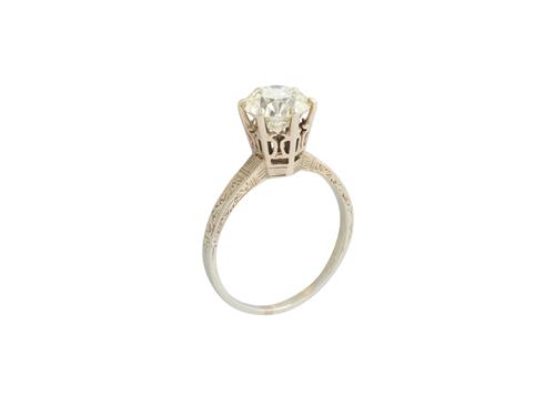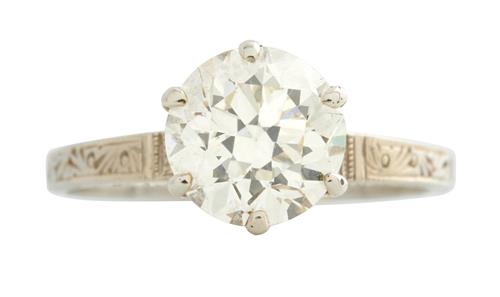 Claw-set with an early brilliant-cut diamond weighing approximately 2.04 carats, size O.