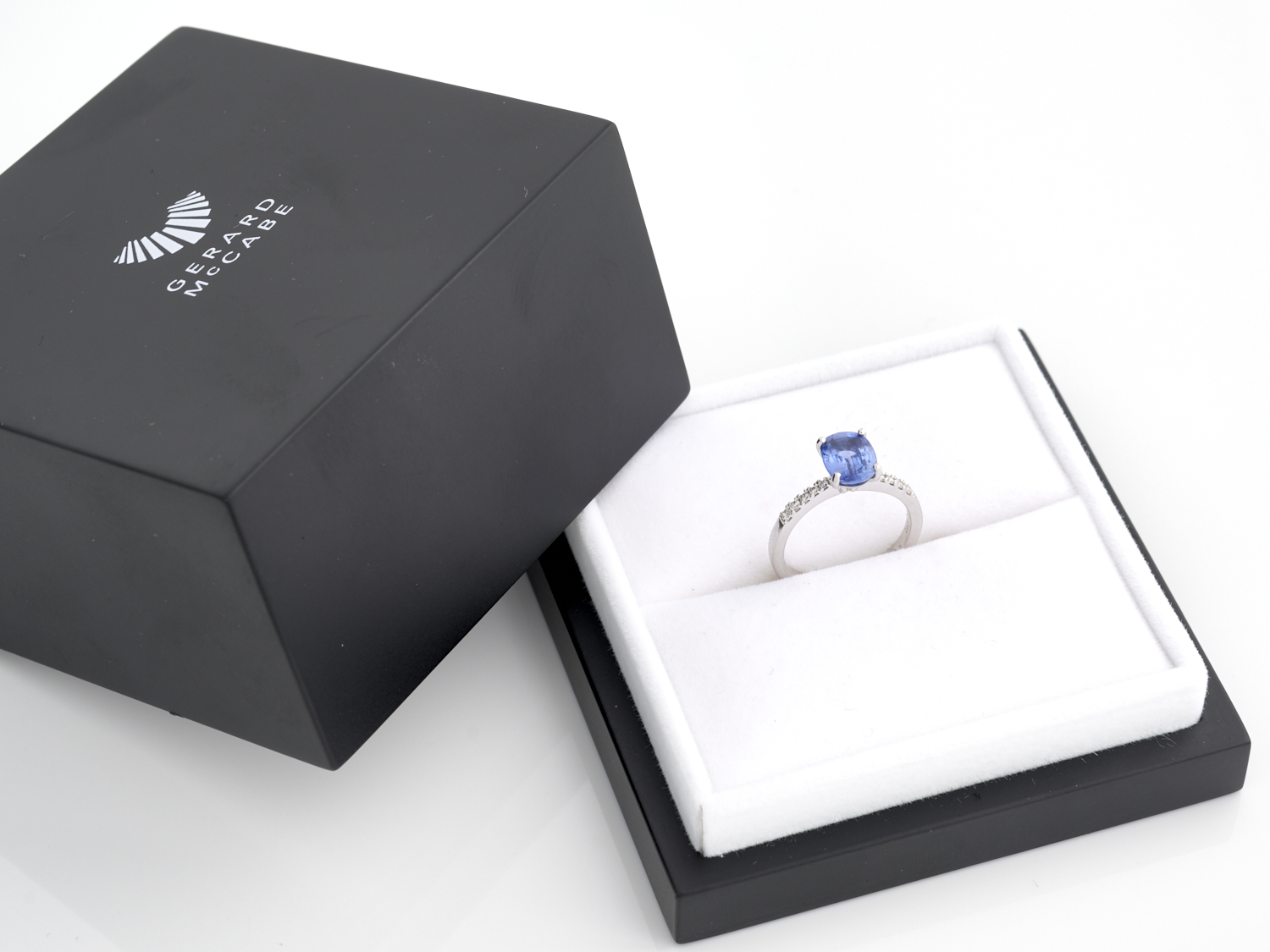 GERARD MCCABE, A CEYLONESE SAPPHIRE AND DIAMOND RING IN 18CT WHITE GOLD, THE SAPPHIRE WEIGHING 2.23CTS AND DIAMONDS TOTALLING 0.15CTS, RING SIZE M, 4.0GMS