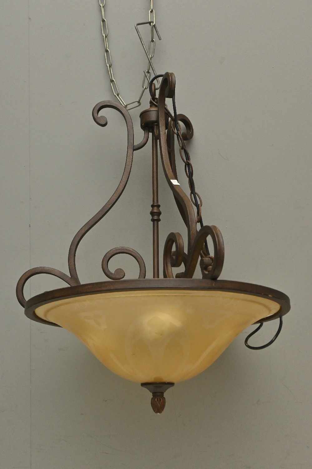 AN ART DECO STYLE METAL CHANDELIER WITH ETCHED GLASS SHADE (58H X 52D CM) (LEONARD JOEL DELIVERY SIZE: X-LARGE)