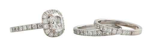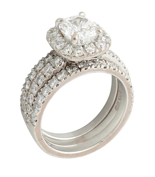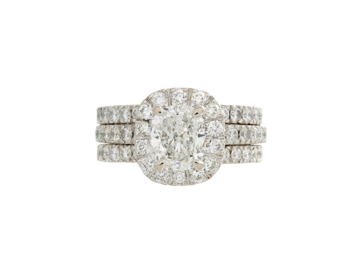 Comprising a cluster ring centring a claw-set cushion-cut diamond weighing 1.53 carats, within a diamond surround to diamond set shoulders, together weighing approximately 0.42 carats, accompanied by two half hoop diamond bands together weighing approximately 0.48 carats, each signed CR for Charles Rose, size K.