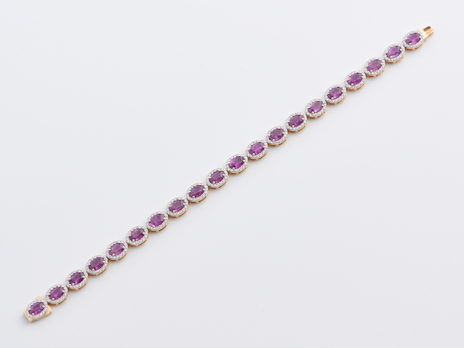 A KASHMIR UNHEATED RUBY AND DIAMOND SET BRACELET IN 14CT GOLD, RUBIES TOTAL 10.66CT, DIAMONDS TOTAL 1.88CTS, TOTAL LENGTH APPROXIMATELY 182MM