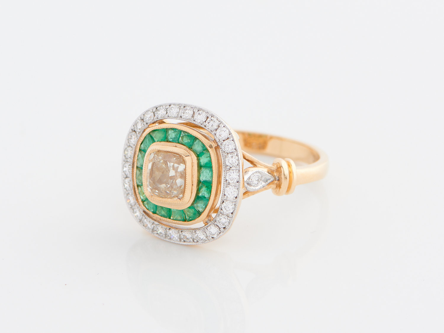 AN EMERALD AND DIAMOND SET RING IN 14CT GOLD, THE CENTRE DIAMOND WEIGHING 1.01CTS, WITH EMERALDS TOTALLING 0.40CTS, SIZE N