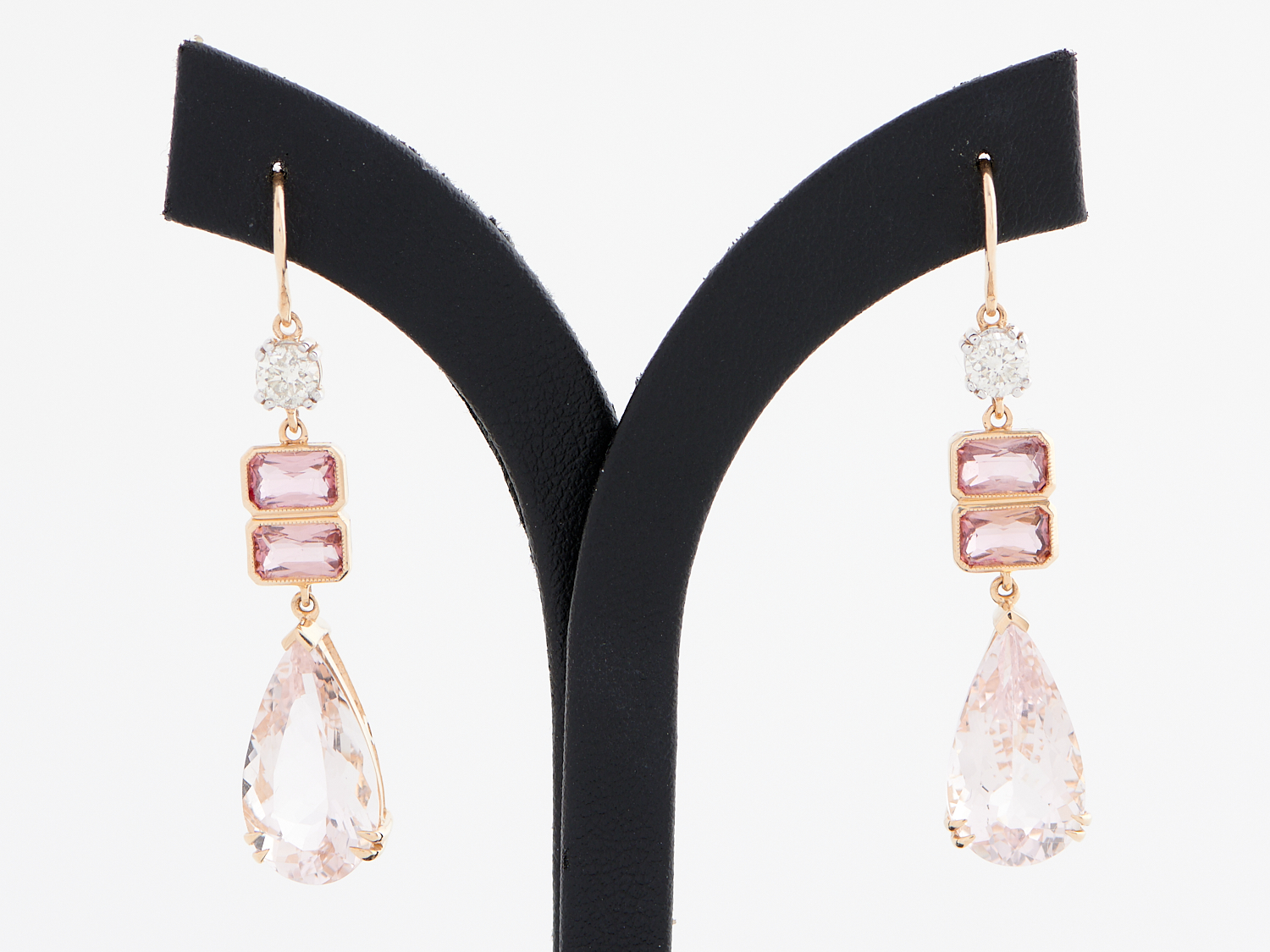 A PAIR OF MORGANITE, PINK TOURMALINE AND DIAMOND SET EARRINGS IN 14CT GOLD, THE MORGANITE TOTALLING 9.56CT, THE TOURMALINE TOTALLING 2.05CT AND DIAMONDS TOTALLING 0.61CT, TO SHEPHERDS HOOK FITTINGS