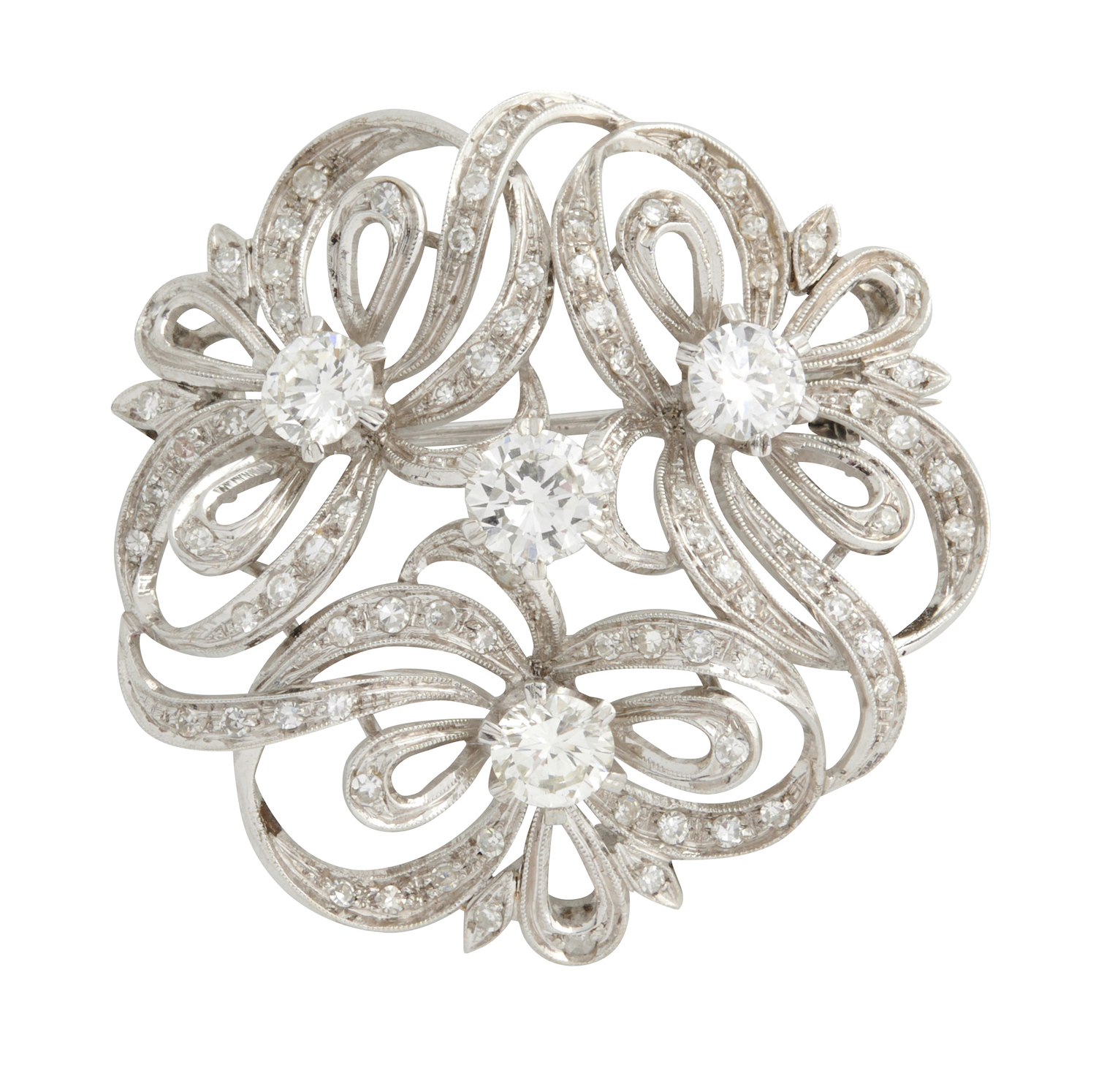 Modelled as a cluster of bow motifs, featuring four principle claw-set brilliant-cut diamonds and set throughout with single-cut diamonds, the diamonds together weighing approximately 2.10 carats, measuring approximately 39mm x 37mm.
