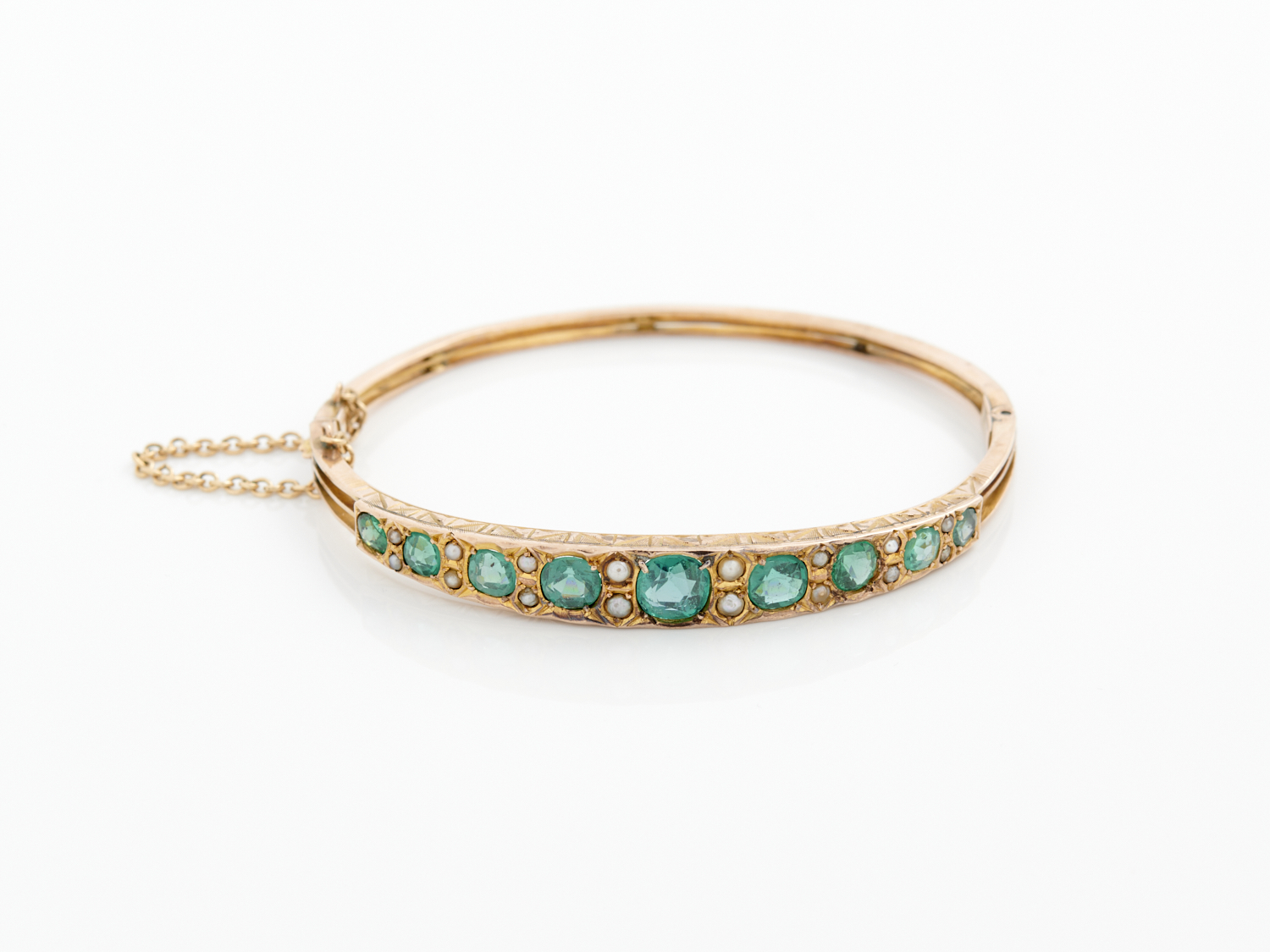A PASTE AND SEED PEARL BANGLE IN 9CT GOLD, INNER CIRCUMFERENCE 170MM, BIRMINGHAM HALLMARKS, 9.00GMS
