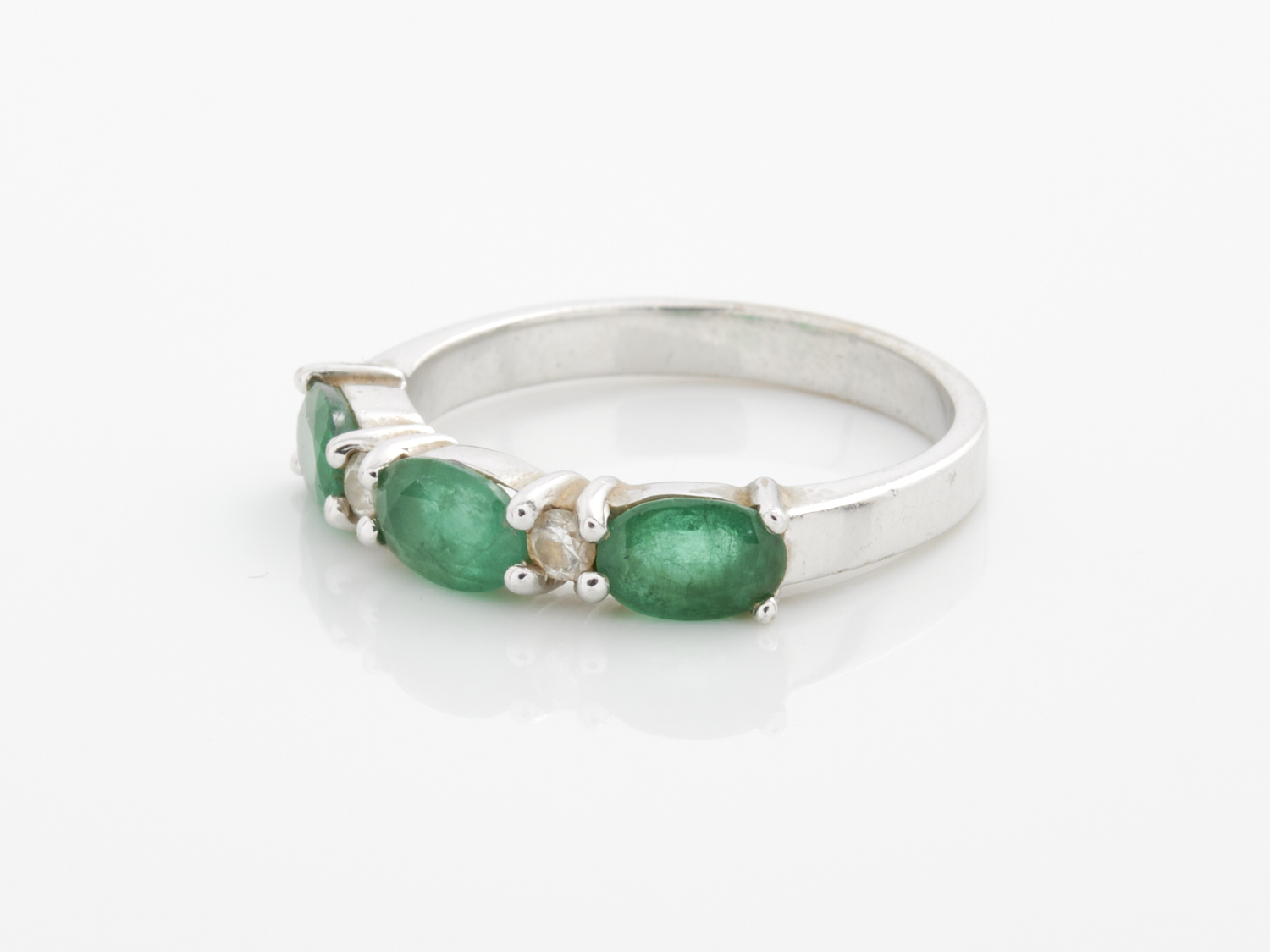 AN EMERALD AND DIAMOND RING IN 9CT WHITE GOLD, THE EMERALDS TOTALLING APPOXIMATELY 1.20CT, THE DIAMONDS TOTALLING APPOXIMATELY 0.04CTS, SIZE N1/2, 2.70GMS