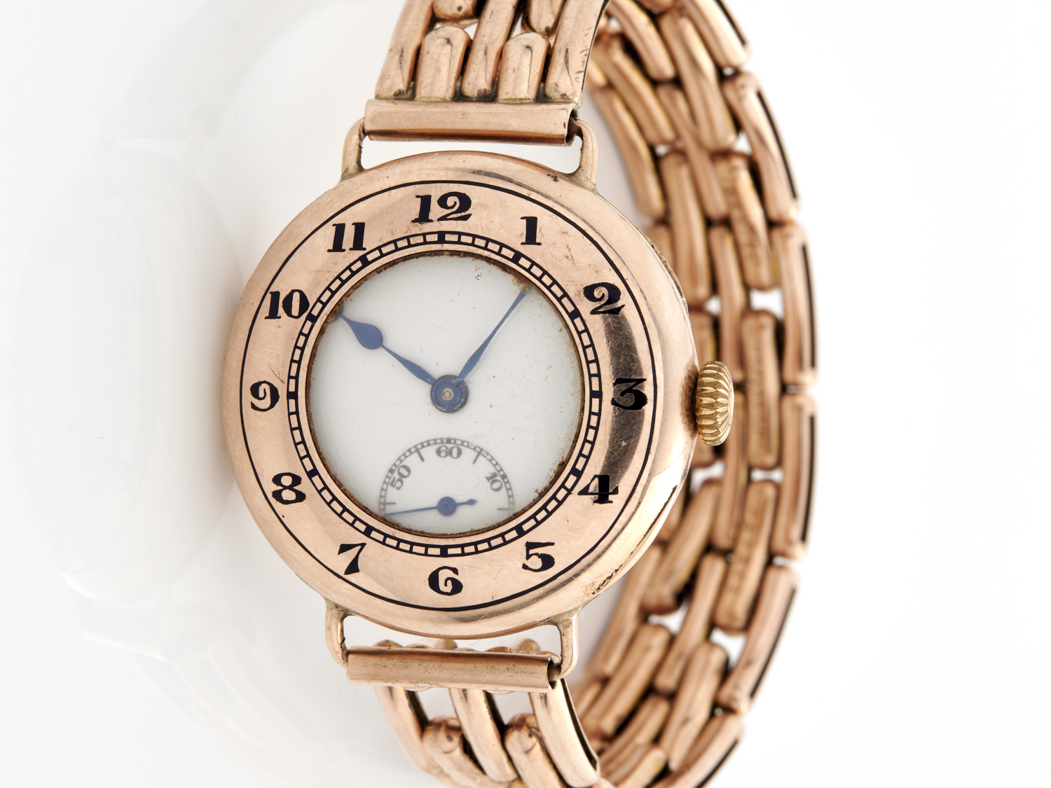 A LADIES WRISTWATCH  TO A CASE AND BANDS IN 9CT ROSE GOLD, MANUAL WIND, THE DIAL MEASURING APPOXIMATELY 30MM, A/F