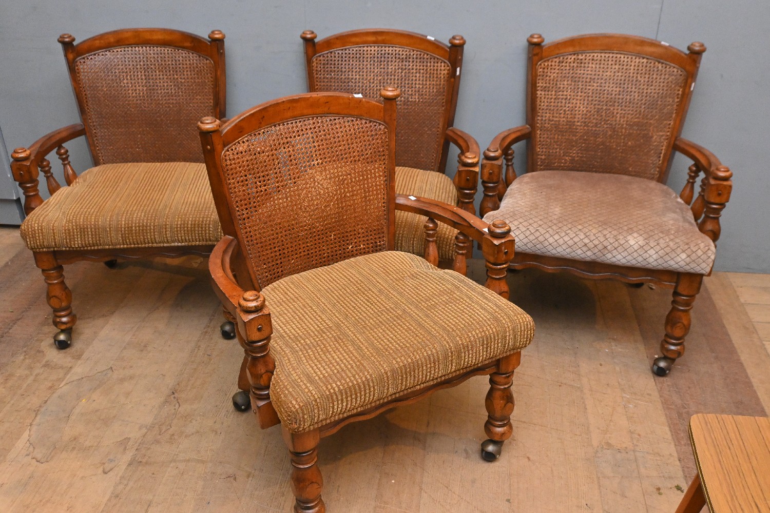 A SET OF FOUR VICTORIAN-STYLE HARWOOD LIBRARY ARMCHAIRS, WITH CANED BACKS AND UPHOLSTERED SEATS (A/F) (84H X 67W X 64D CM) (PLEASE NOTE THIS HEAVY ITEM MUST BE REMOVED BY CARRIERS AT THE CUSTOMER'S EXPENSE. LEONARD JOEL STAFF CANNOT ASSIST CARRYING THIS ITEM) (X-LARGE ITEM)