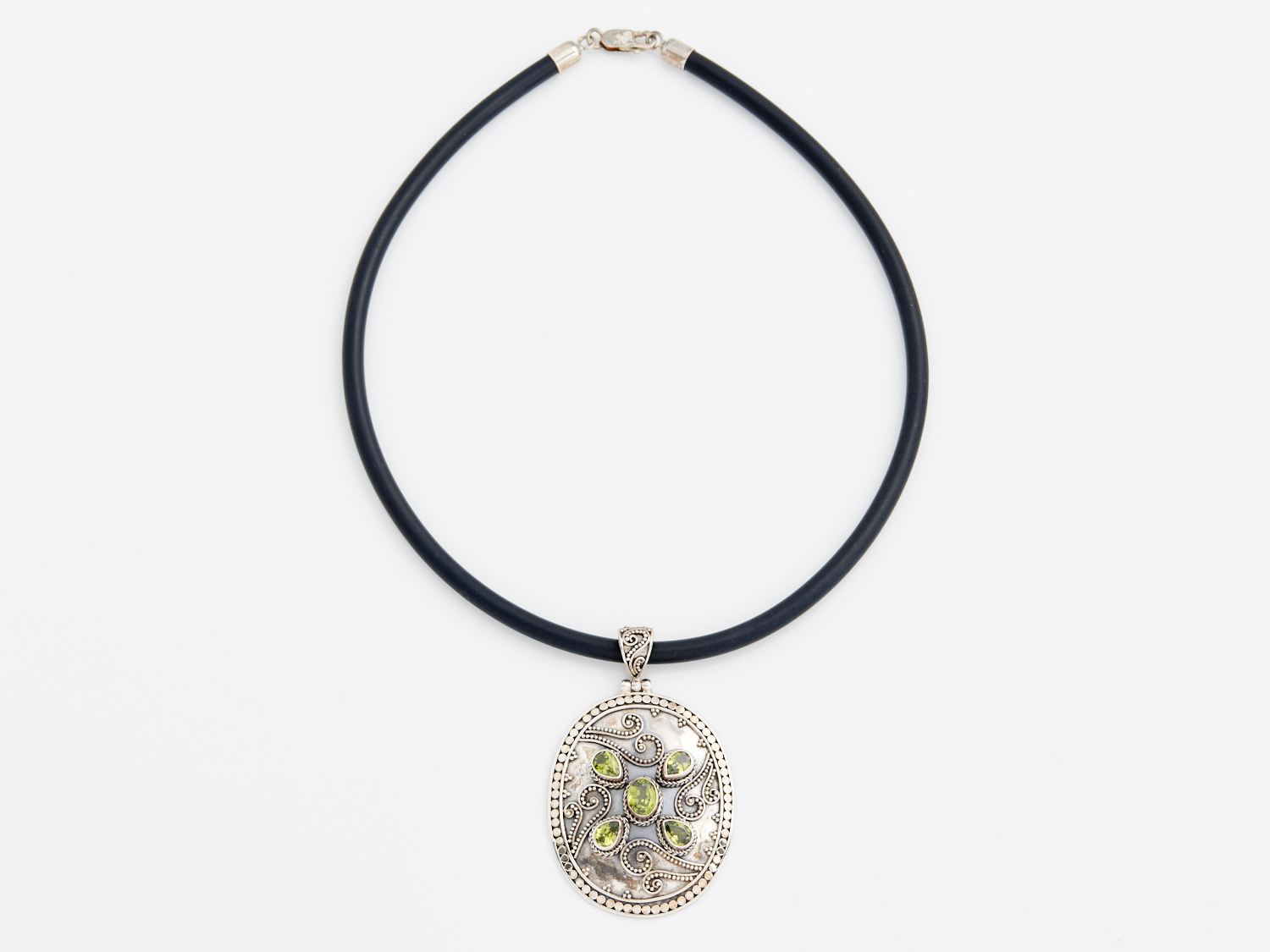 A PERIDOT SET PENDANT IN SILVER TO A NEOPRENE COLLAR, THE PENDANT MEASURING 60 X 40MM, COLLAR LENGTH 420MM