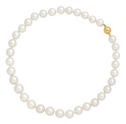 Comprising thirty-three graduating round pearls of white hues measuring approximately 12.00mm to 14.80mm, completed by a ball clasp in 9ct gold,