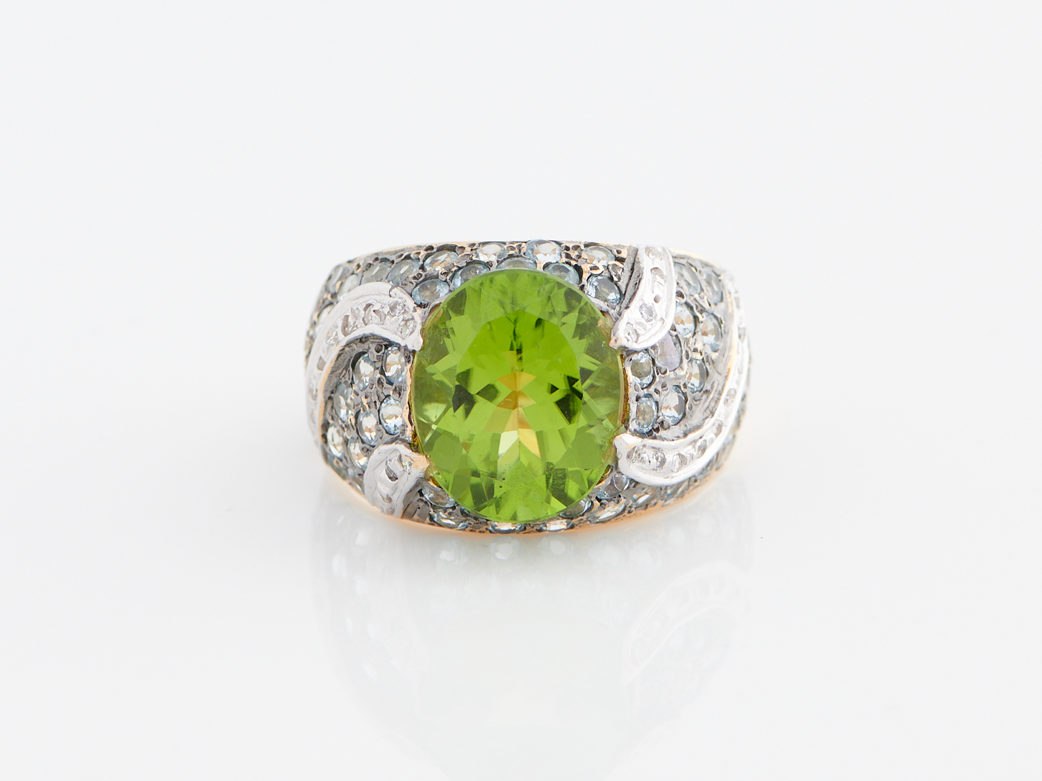 A PERIDOT, BLUE TOPAZ AND DIAMOND RING IN 14CT GOLD, THE PERIDOT OF APPROXIMATELY 7CTS, RING SIZE N-O