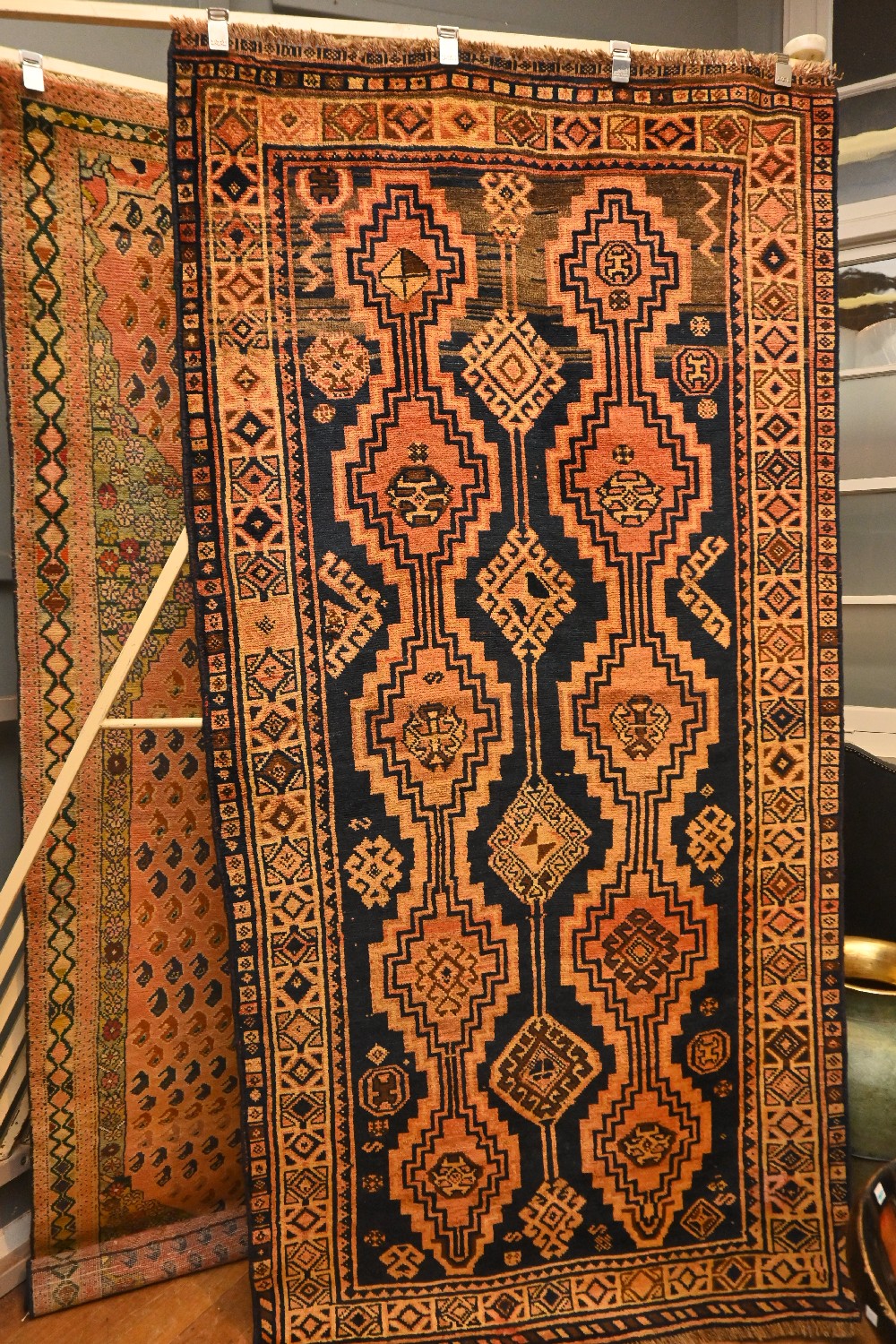 A GEOMETRIC DESIGN CIRCA 1970'S TRIBAL PERSIAN LURI RUG, 100% WOOL & NATURAL DYES. TRIBAL WEAVE & DESIGN OF TRIPLE POLE HEXAGONAL ANCHORED MEDALLIONS IN A GOLD TONES ON A ROYAL BLUE FIELD WITH GEOMETRIC PATTERNS. BORDER OF TRIBAL GEOMETRIC PATTERNS. SOME NATURAL ABRASH. SIZE: 247 X 128 CM. ORIGIN: IRAN - RRP: $1,400. DOCUMENTATION OF AUTHENTICITY INCLUDED